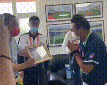 而在早先举行的棒球比赛中,香港队在结束所有比赛后收到了赛事举办地西安市鄠邑区赠送的礼物——由当地农民画家绘制的陕西文化特产:户县农民画。几名队员爱不释手,捧起画对着相机比起了“耶”。