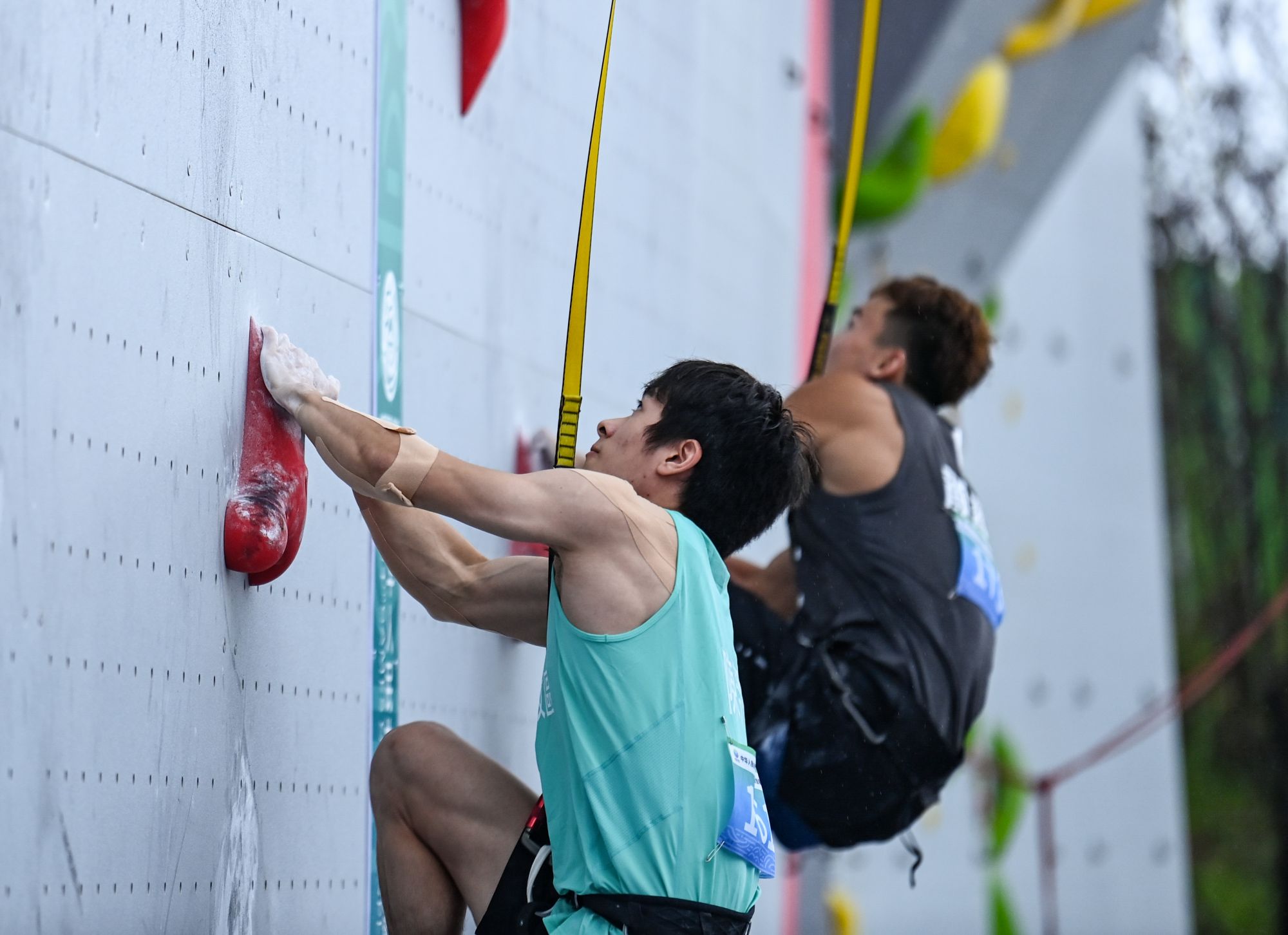 9月17日,中国香港队选手陈翔志在第十四届全运会攀岩男子速度预赛中。新华社记者王曦摄