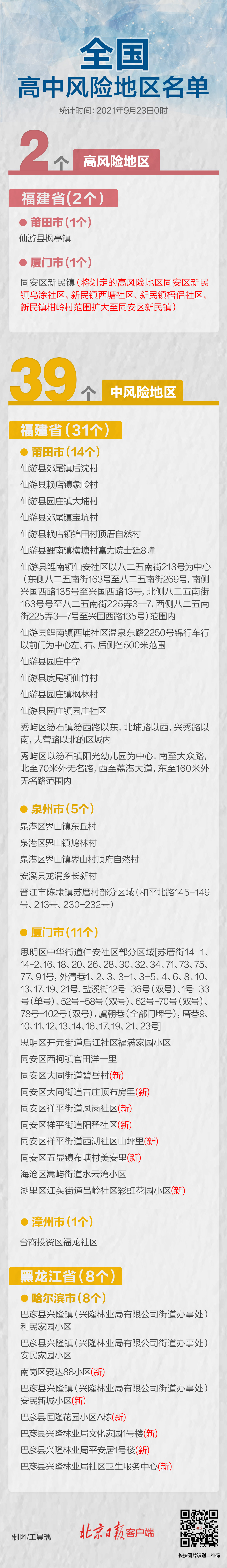 目前,全国共有高中风险区2+39个,在福建、黑龙江两省。