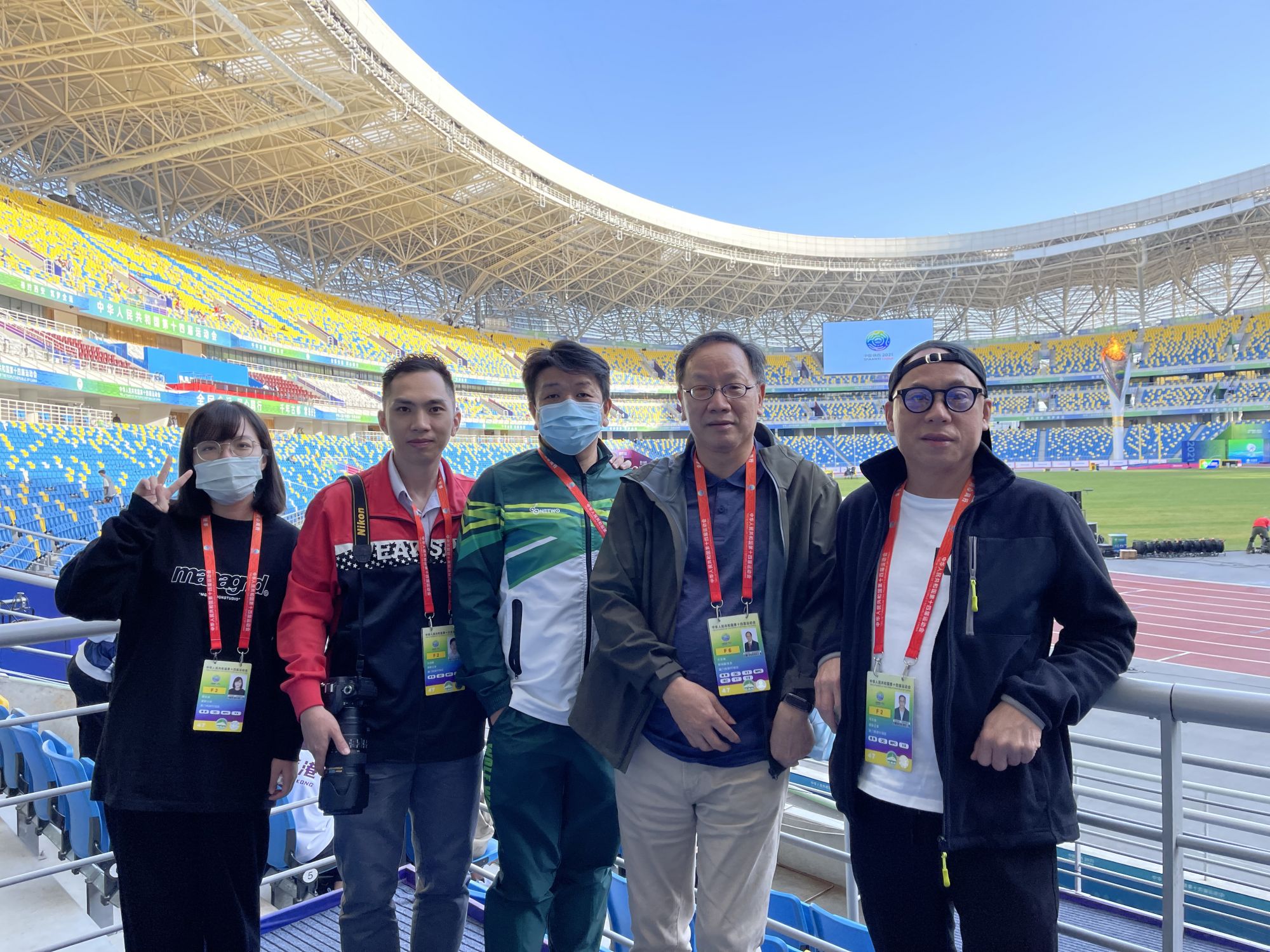 图为古桢辉(左二)和其他澳门媒体记者在西安奥体中心合影。