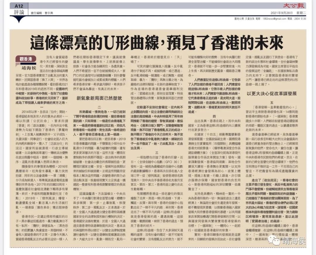 香港《大公报》今日刊发靖海侯专栏文章。3000多字,半个版面,聚焦这条"U形曲线”,对香港两年来走过的路进行了探究。香港变化之源、变化之力、持续变化之可能,文章均给出了分析。