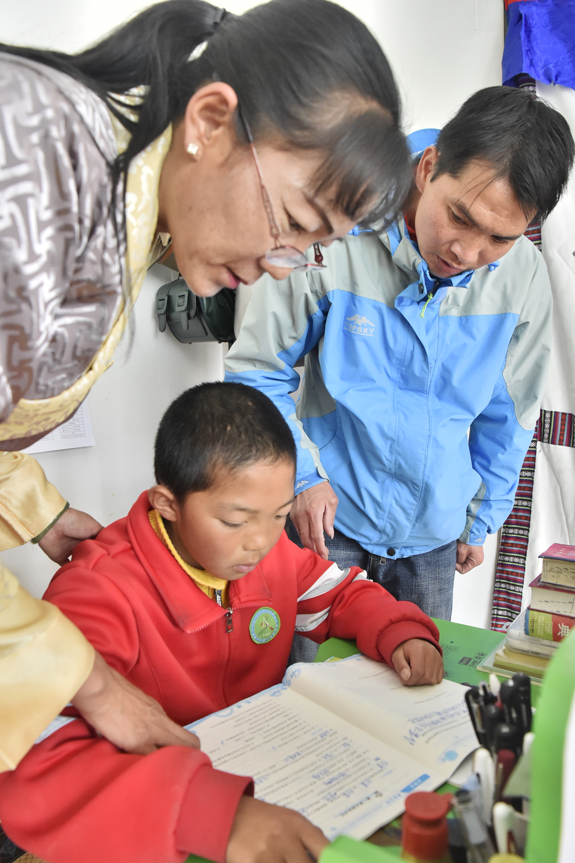 ↑13年前,刘美桥(右)从广东韶关来到西藏阿里狮泉河镇工作,他与当地藏族姑娘央宗相识,并于2009年结婚。图为夫妻二人辅导儿子刘晓篪(藏族名为旦赐阿旺)做作业(9月24日摄)。