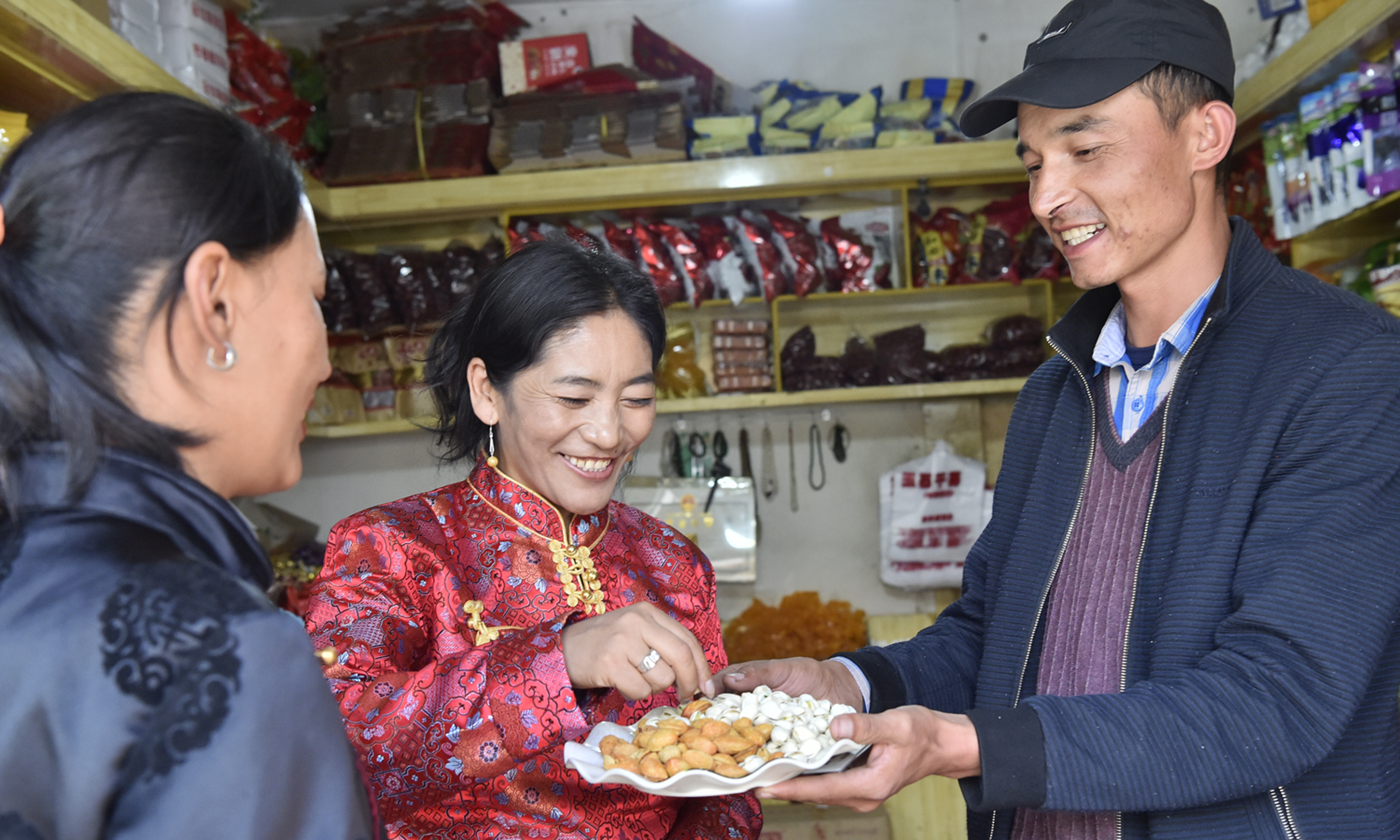 ↑阿卜杜杰力力·麦提如刚(右)于2010年从新疆和田墨玉县来到西藏阿里狮泉河镇做干果生意,并融入到狮泉河镇藏布居委会的民族大家庭中。图为阿卜杜杰力力·麦提如刚请当地藏族朋友品尝来自家乡的特产(9月22日摄)。