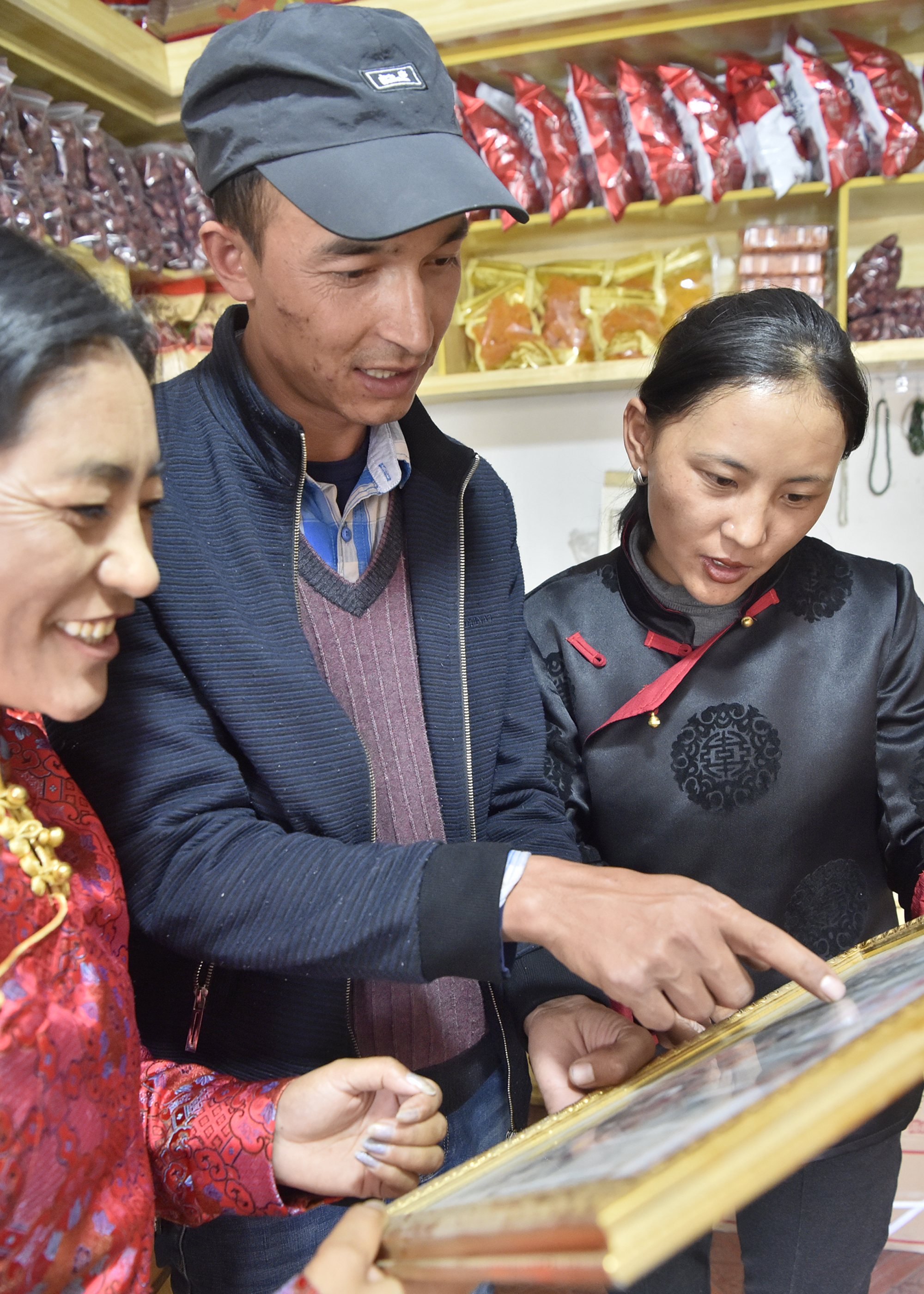 ↑从新疆和田墨玉县来到西藏阿里狮泉河镇的阿卜杜杰力力·麦提如刚(中)给邻居们看自己的家庭合影(9月22日摄)。