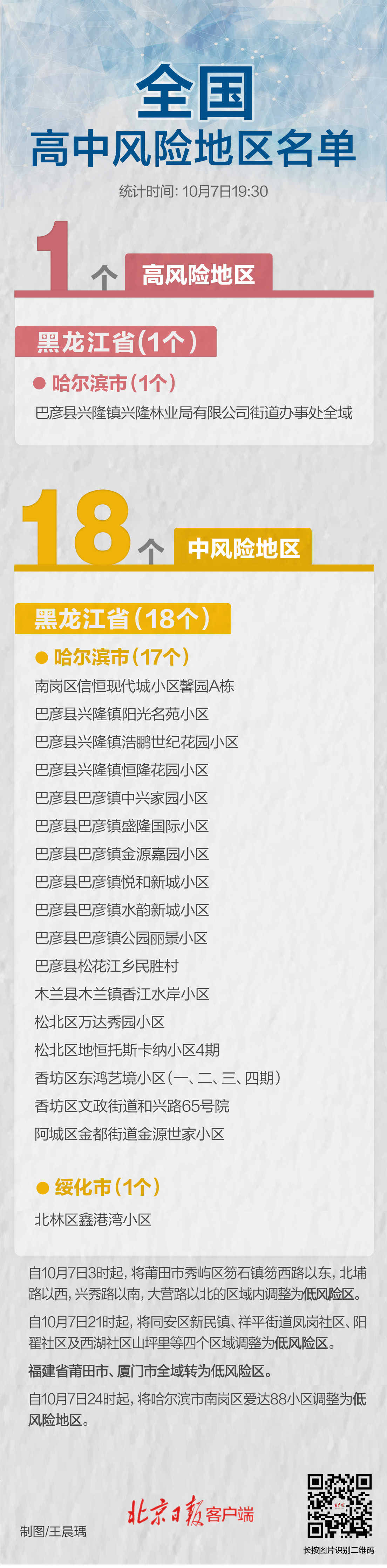 根据国务院联防联控机制有关规定,经专家咨询组综合评估研判,哈尔滨市指挥部决定,自2021年10月7日24时起,将哈尔滨市南岗区爱达88小区调整为低风险地区。其他地区风险等级不变。