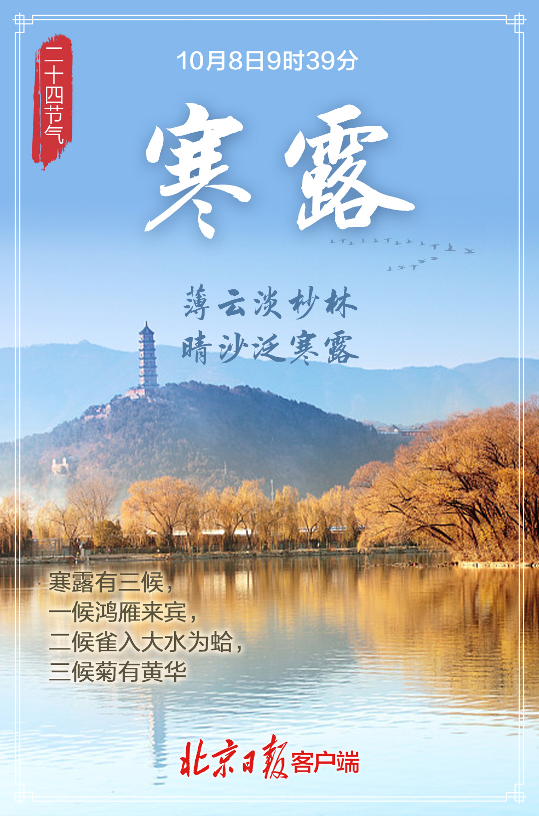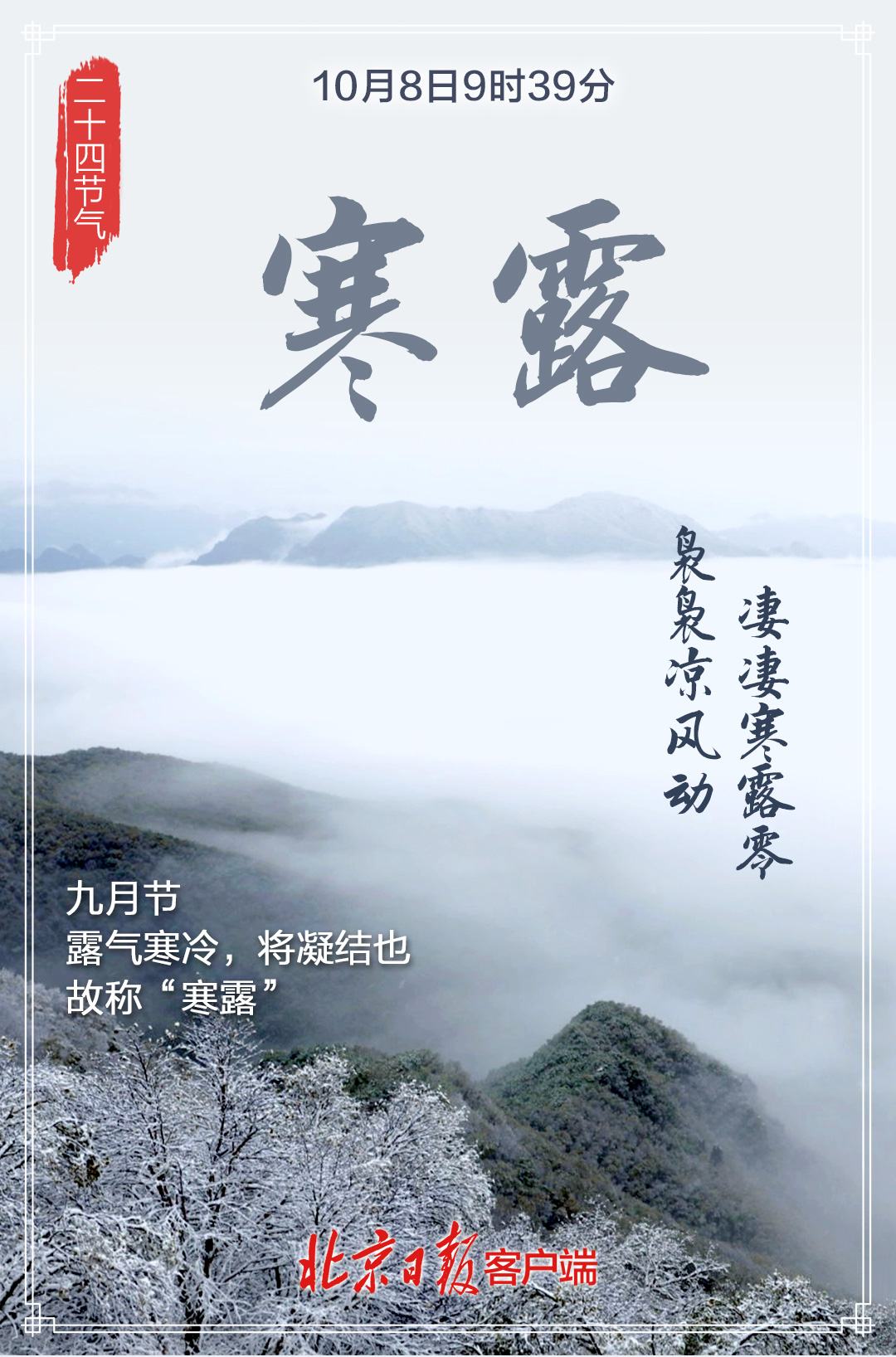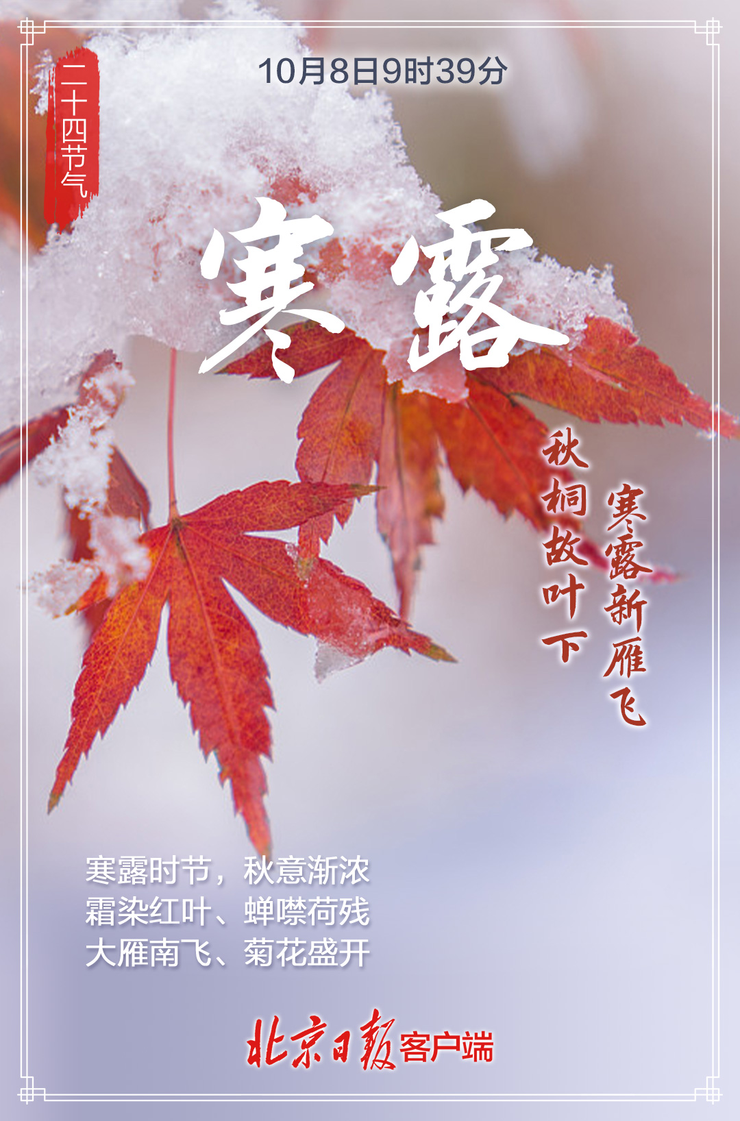 10月8日9时39分,迎来“寒露”节气。这是二十四节气中第一个带“寒”字的节气。每年公历的10月7日、8日或9日,太阳到达黄经195度,为“寒露”节气开始。此时节,北半球阳光照射角度明显倾斜,地面接收的阳光热量显著减少,白天秋高气爽,夜晚冷若冰霜。
