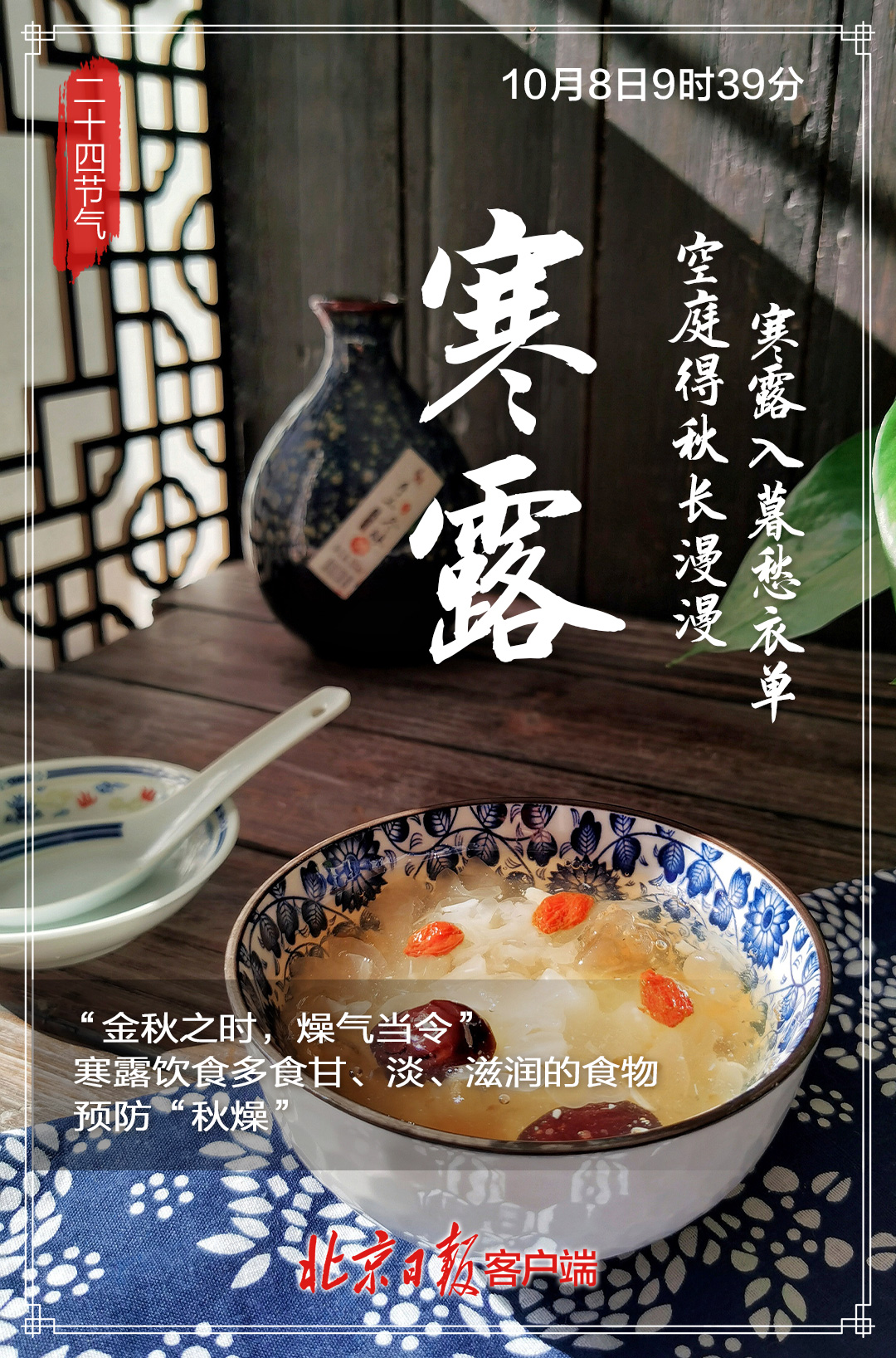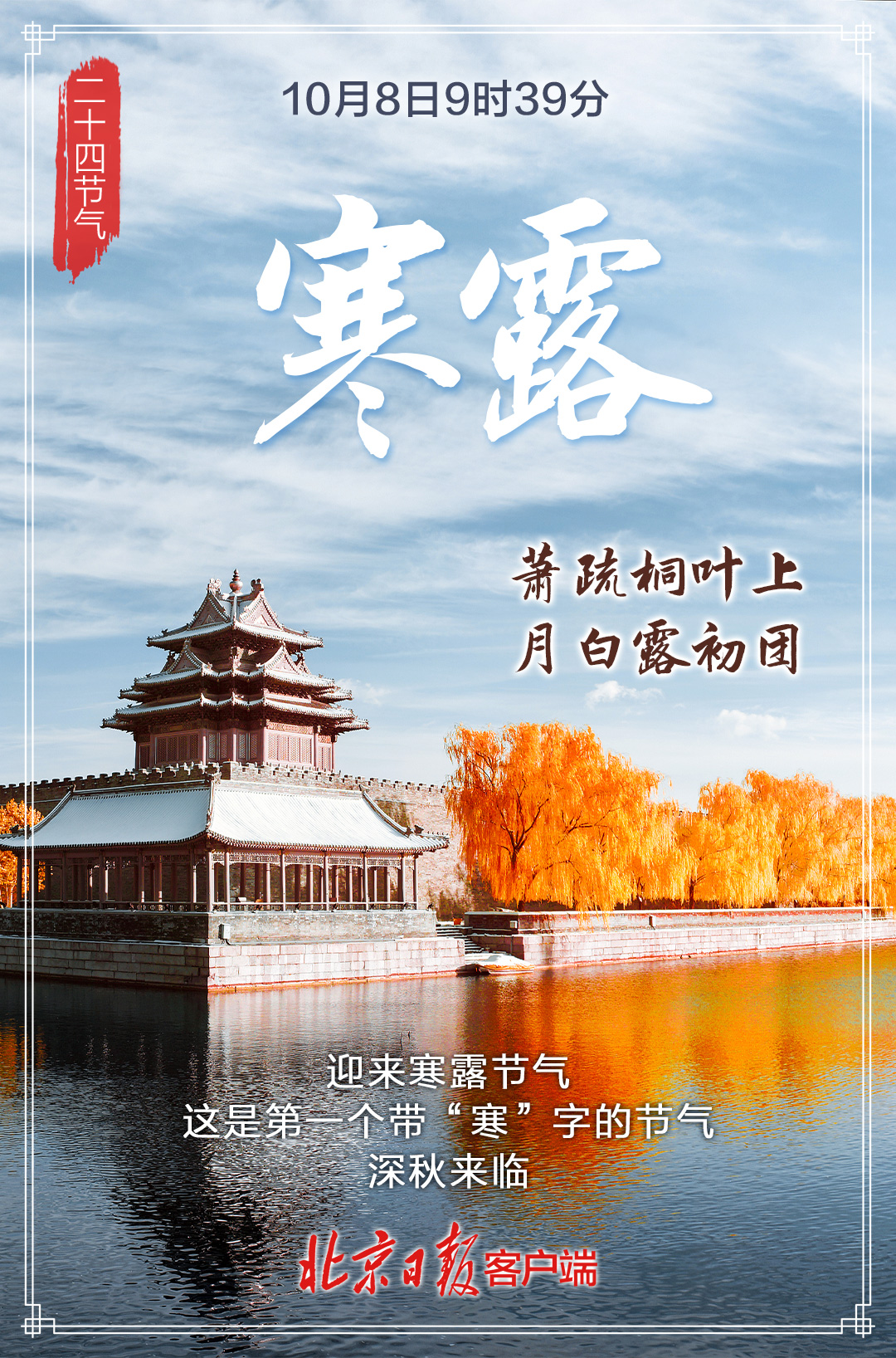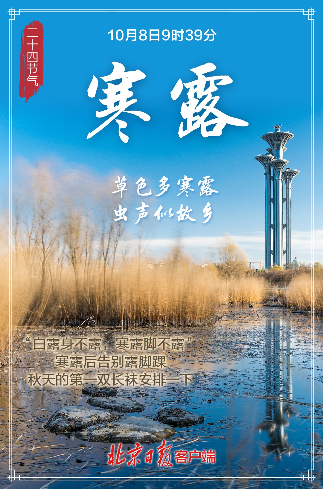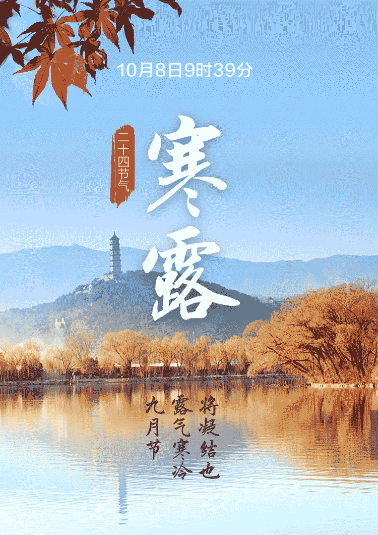 10月8日9时39分,迎来“寒露”节气。这是二十四节气中第一个带“寒”字的节气。每年公历的10月7日、8日或9日,太阳到达黄经195度,为“寒露”节气开始。此时节,北半球阳光照射角度明显倾斜,地面接收的阳光热量显著减少,白天秋高气爽,夜晚冷若冰霜。