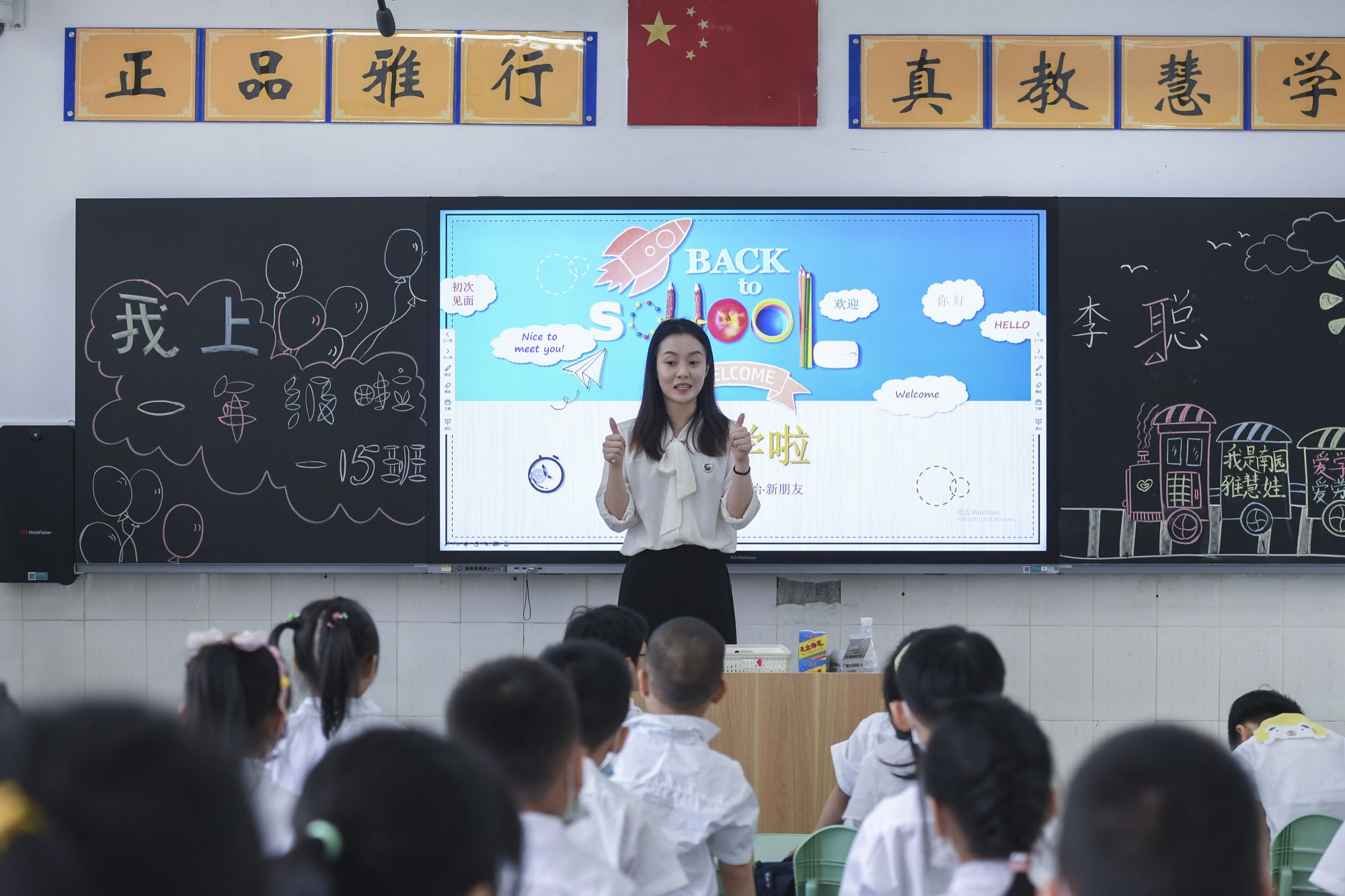 9月1日,在深圳市福田区南园小学一(15)班,首批“事业编”的港籍教师黄晓蕾在英语课上与孩子交流。新华社记者 毛思倩 摄