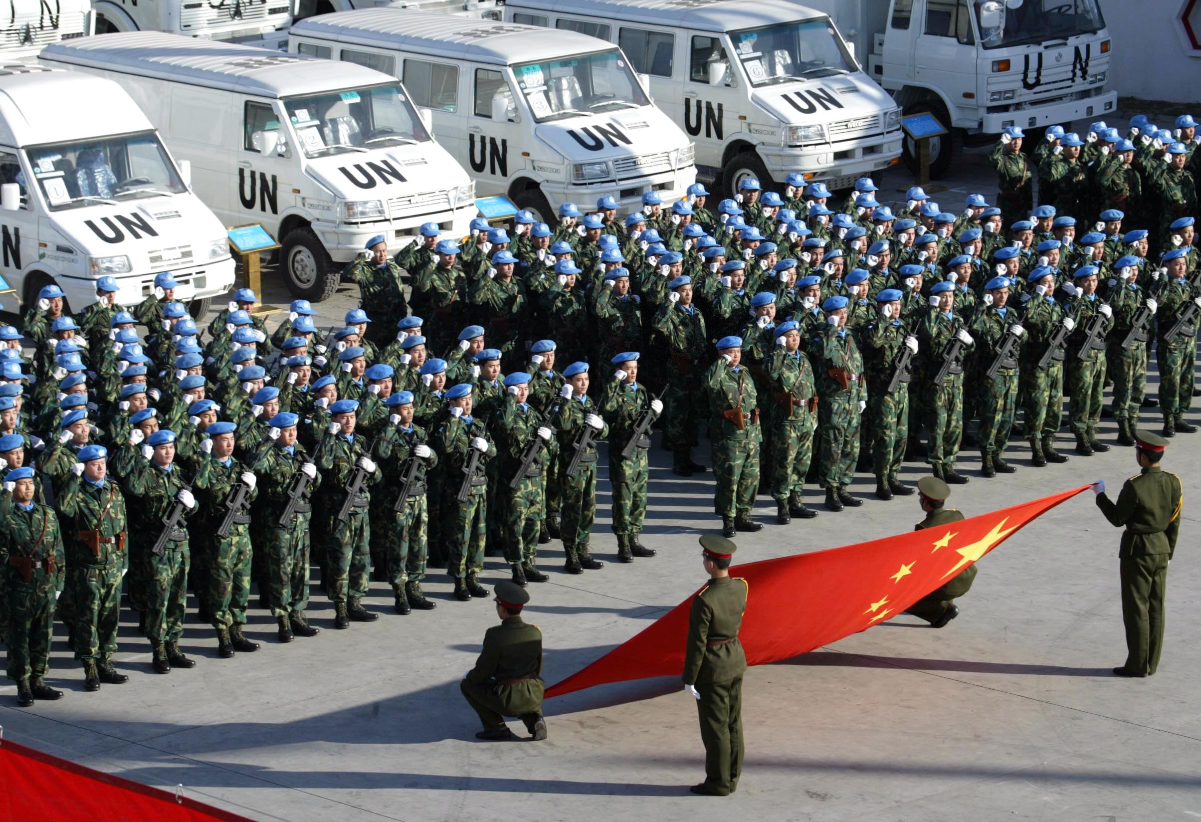 2003年12月9日,中国赴利比里亚维和部队运输连官兵出发前面向国旗庄严宣誓。当日,中国赴利比里亚维和部队首批60名官兵从北京首都机场启程。中国政府决定向利比里亚派遣550人的维和部队,从当日起分批前往任务地区。新华社记者 王建民 摄