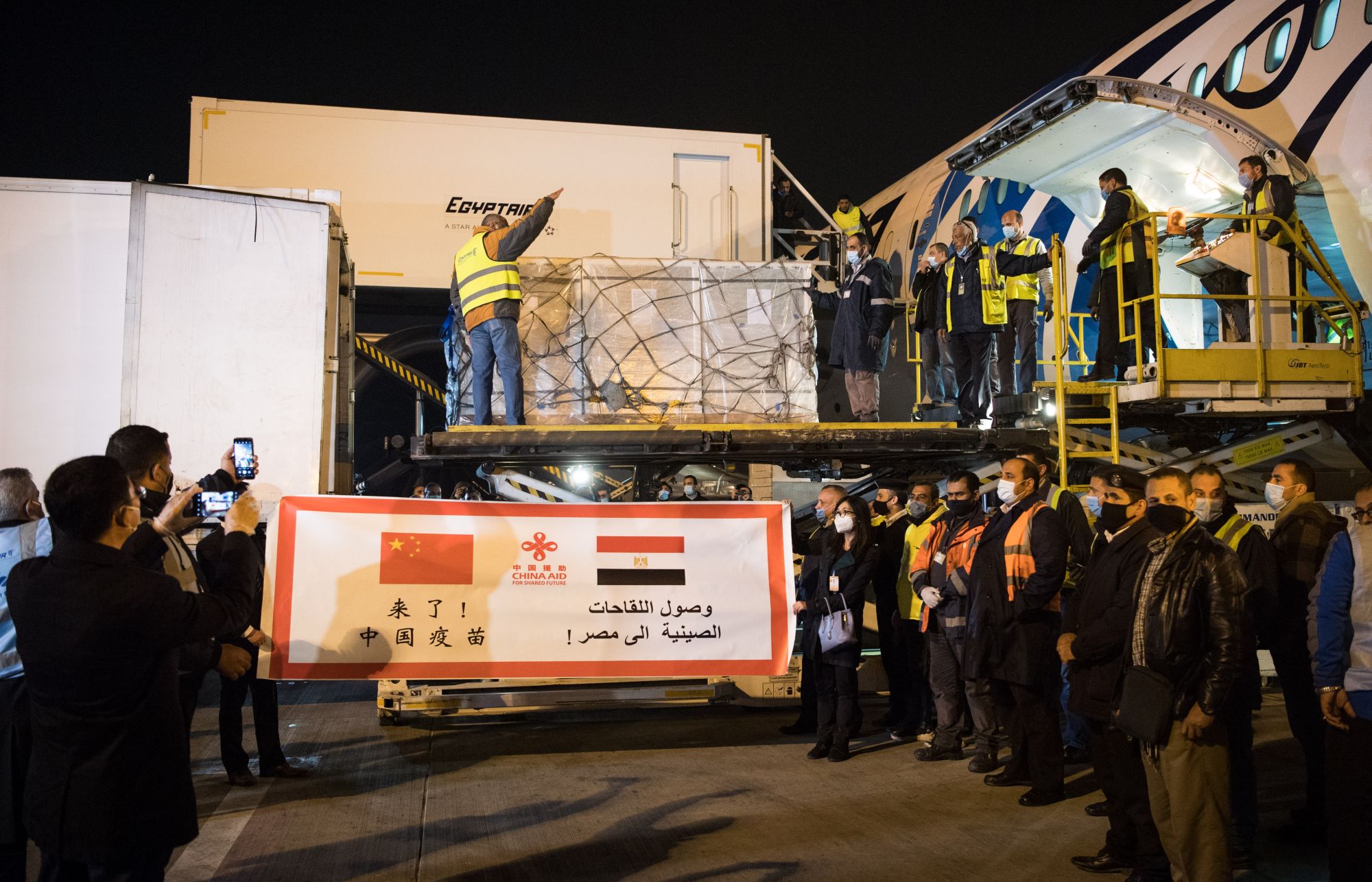2021年2月23日凌晨,在埃及开罗国际机场,工作人员运输中国援助埃及的首批新冠疫苗。新华社记者 邬惠我 摄