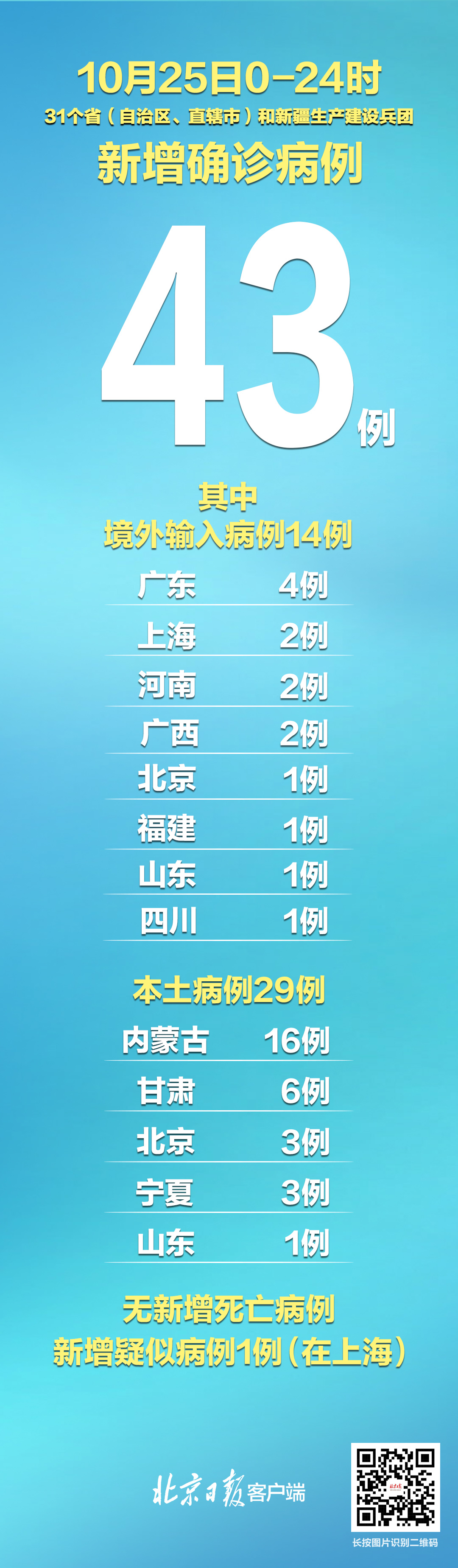 10月25日0—24时,31个省(自治区、直辖市)和新疆生产建设兵团报告新增确诊病例43例。其中境外输入病例14例(广东4例,上海2例,河南2例,广西2例,北京1例,福建1例,山东1例,四川1例),含4例由无症状感染者转为确诊病例(河南2例,广东1例,四川1例);本土病例29例(内蒙古16例,其中阿拉善盟15例、鄂尔多斯市1例;甘肃6例,均在兰州市;北京3例,均在昌平区;宁夏3例,其中银川市1例、吴忠市1例、中卫市1例;山东1例,在日照市),含2例由无症状感染者转为确诊病例(均在宁夏)。无新增死亡病例。新增疑似病例1例,为境外输入病例(在上海)。