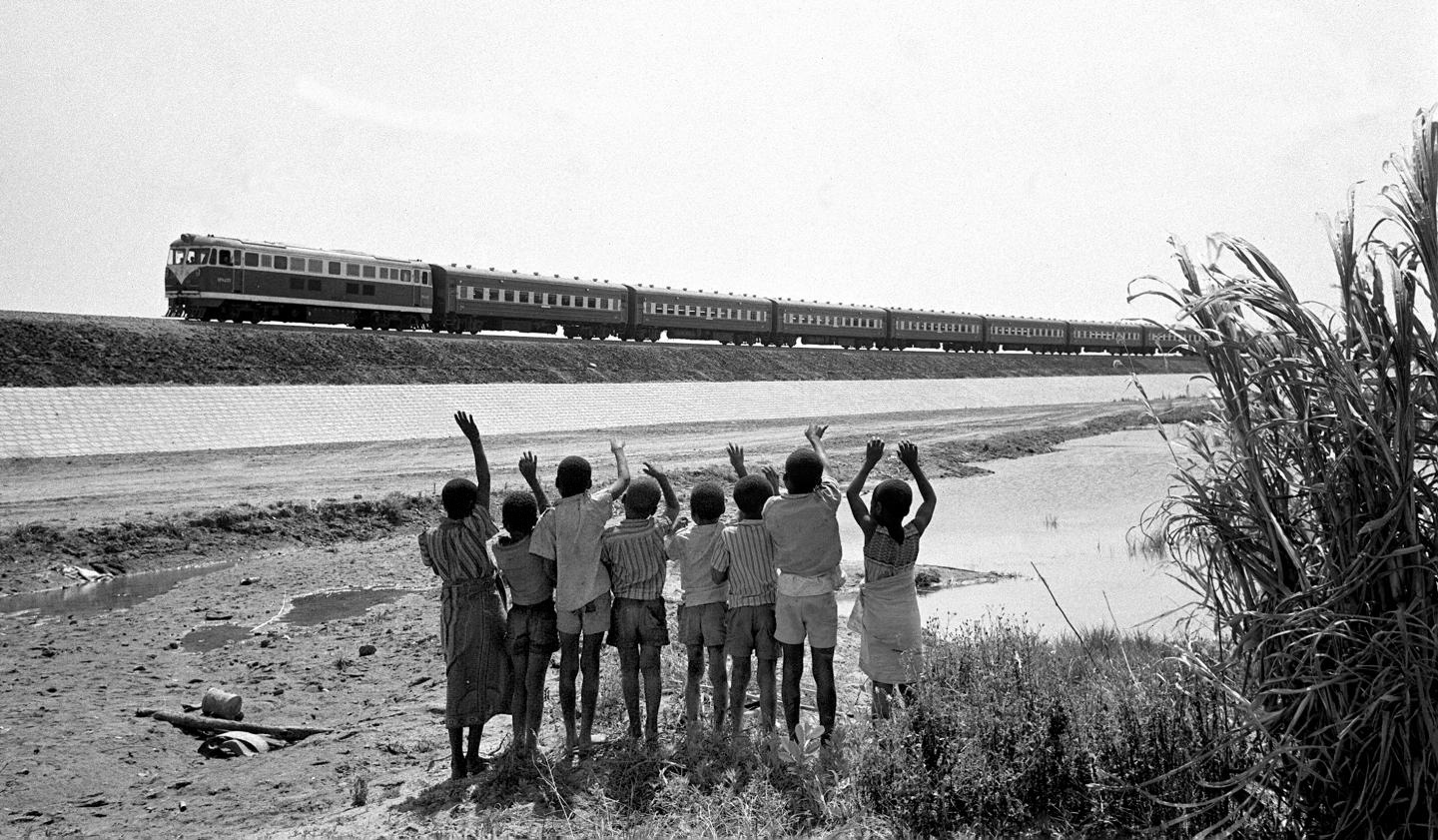 ↑1976年,赞比亚鲁西瓦西湖畔的少年儿童欢迎坦赞铁路的列车通到他们的家乡。