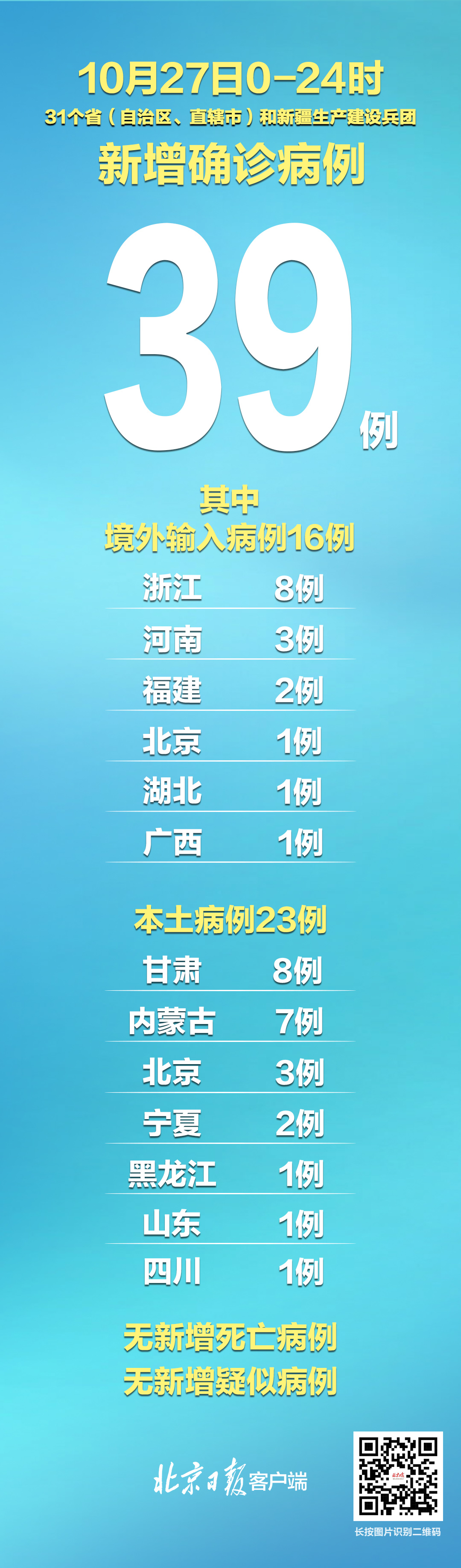 10月27日0—24时,31个省(自治区、直辖市)和新疆生产建设兵团报告新增确诊病例39例。其中境外输入病例16例(浙江8例,河南3例,福建2例,北京1例,湖北1例,广西1例),含8例由无症状感染者转为确诊病例(均在浙江);本土病例23例(甘肃8例,其中张掖市4例、兰州市1例,兰州新区1例,嘉峪关市2例;内蒙古7例,均在阿拉善盟;北京3例,均在昌平区;宁夏2例,均在银川市;黑龙江1例,在黑河市;山东1例,在日照市;四川1例,在自贡市),含2例由无症状感染者转为确诊病例(北京1例,四川1例)。无新增死亡病例。无新增疑似病例。