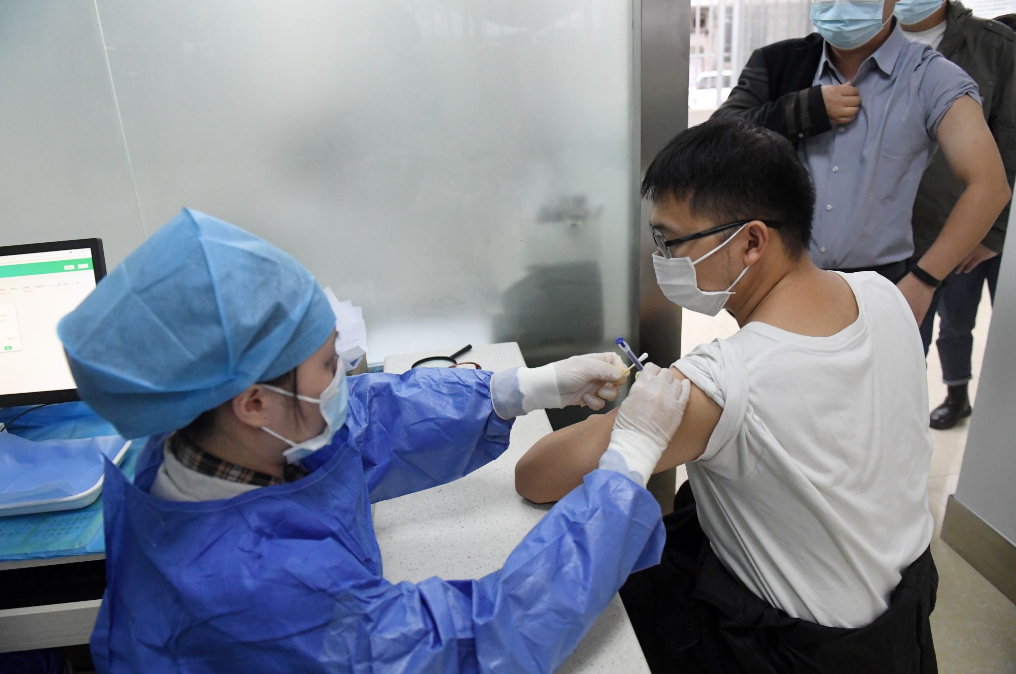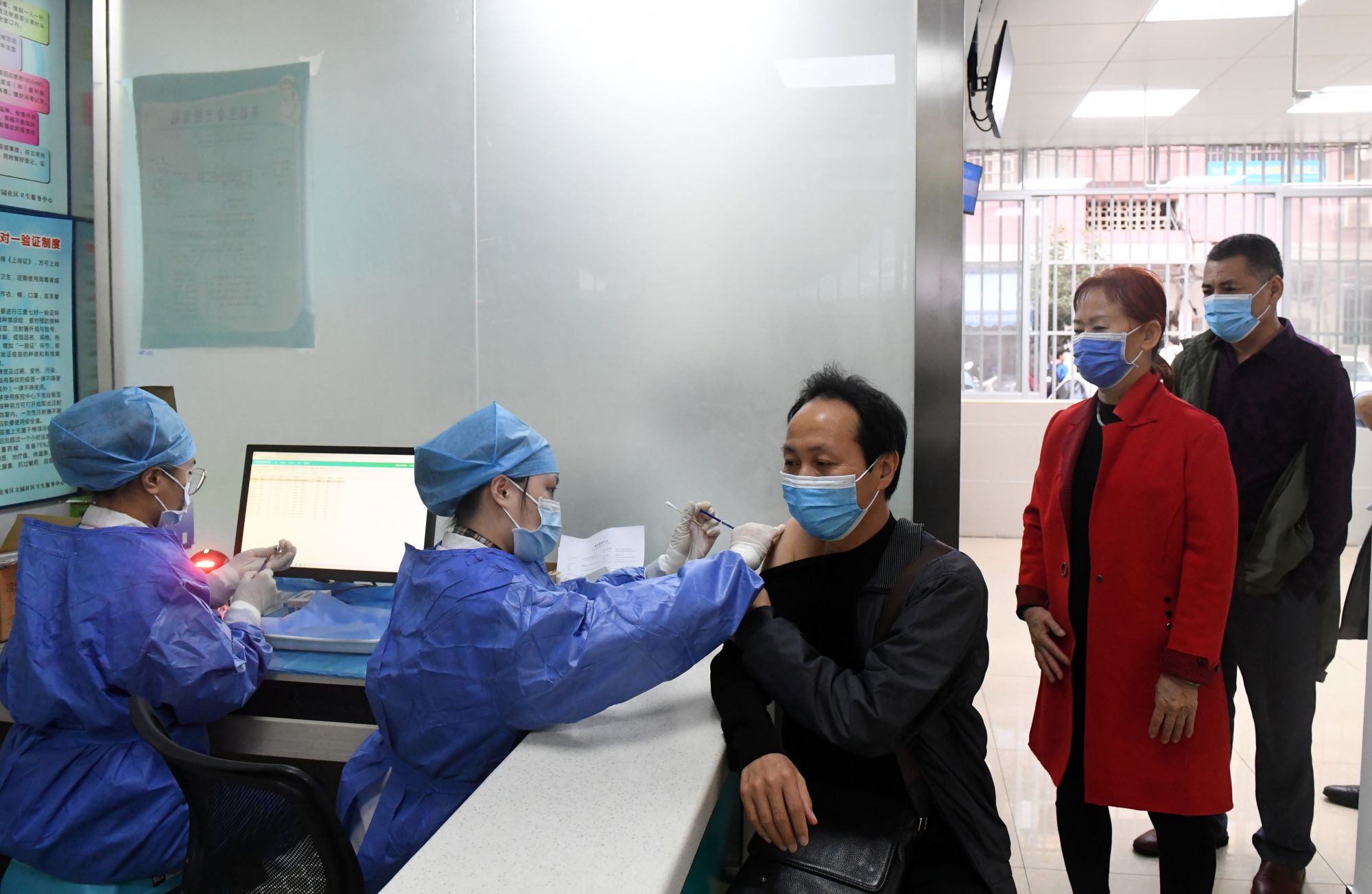 11月2日,在南宁市青秀区方园社区卫生服务中心,医务人员给居民接种新冠疫苗加强针。