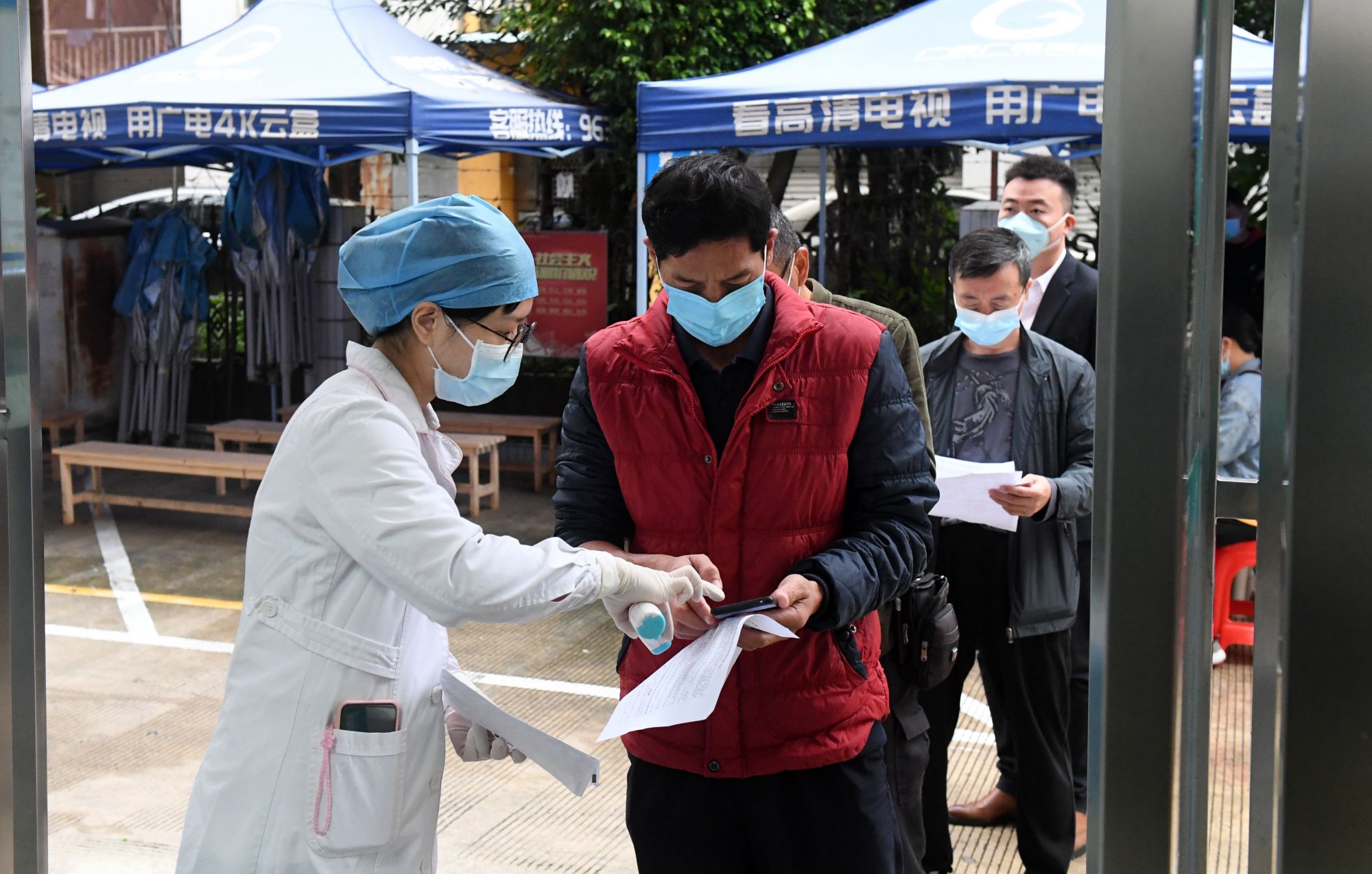 11月2日,在南宁市青秀区方园社区卫生服务中心,医务人员核对准备接种新冠疫苗加强针居民的信息。