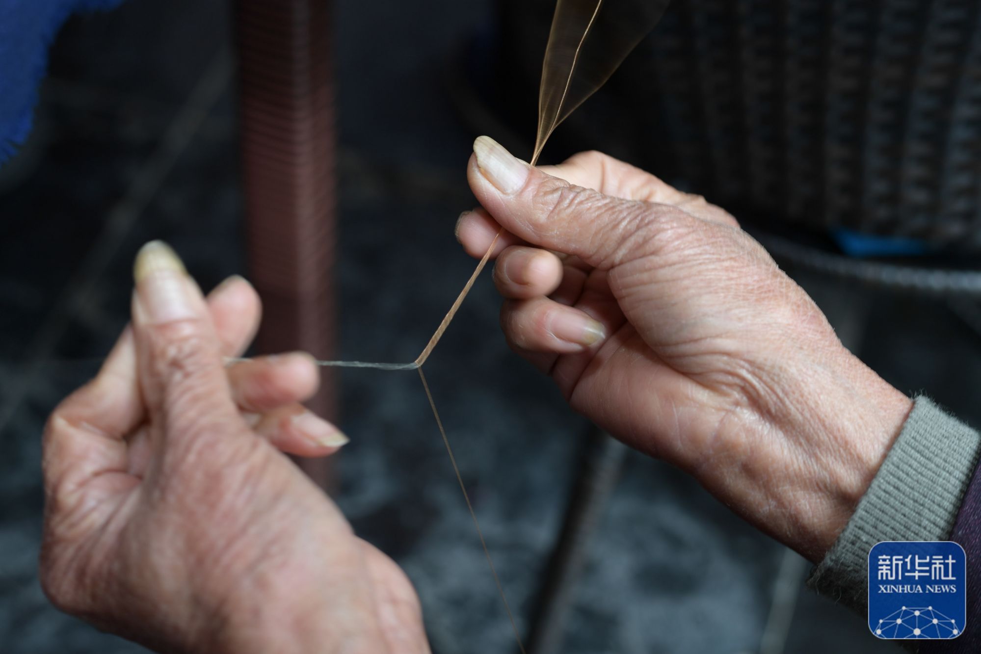 11月2日,在黔南布依族苗族自治州三都水族自治县中和镇雪花湖移民社区一家马尾绣手工坊,水族手工艺人在搓马尾线。新华社记者 杨楹 摄