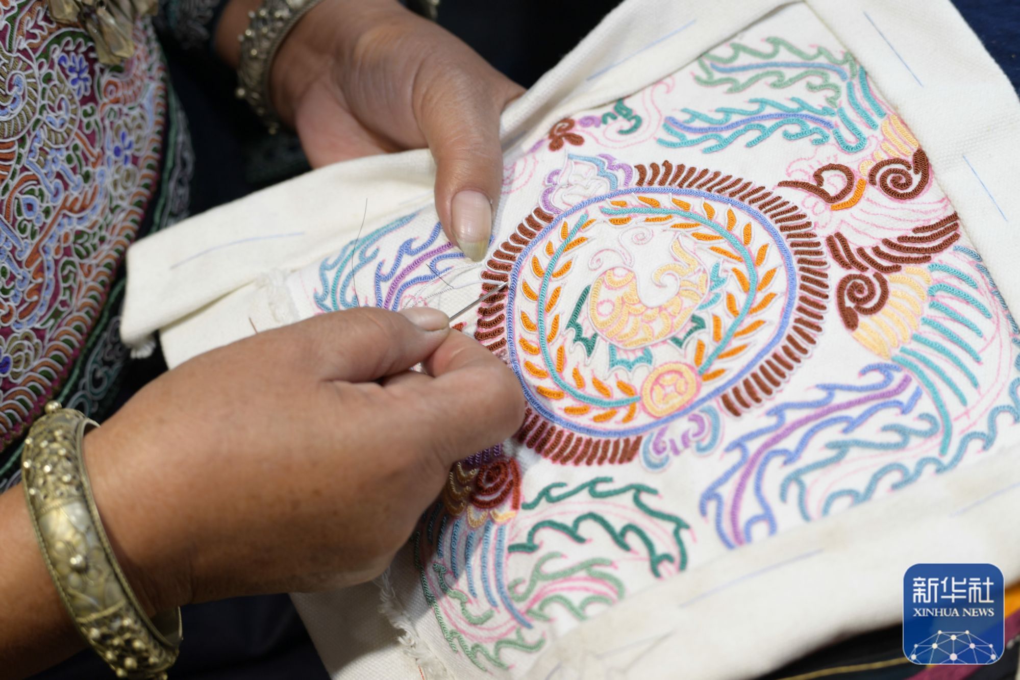11月2日,在黔南布依族苗族自治州三都水族自治县中和镇雪花湖移民社区一家马尾绣手工坊,水族手工艺人在制作马尾绣。新华社记者 杨楹 摄
