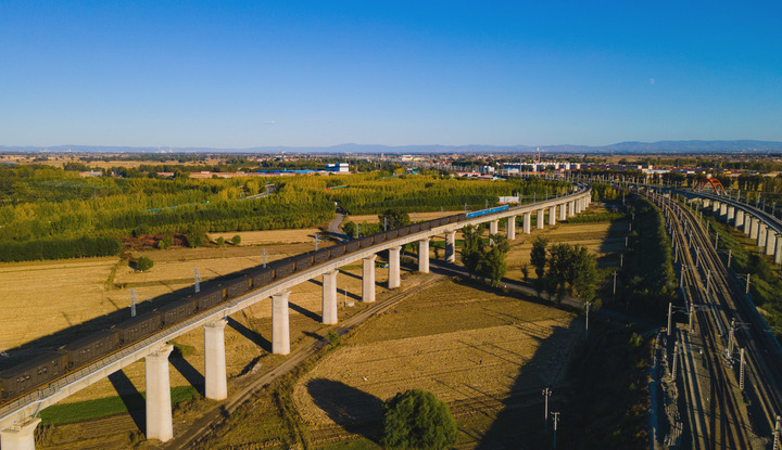 ↑运煤专列行驶在呼和浩特境内(10月15日摄,无人机照片)。新华社发(夏亮 摄)