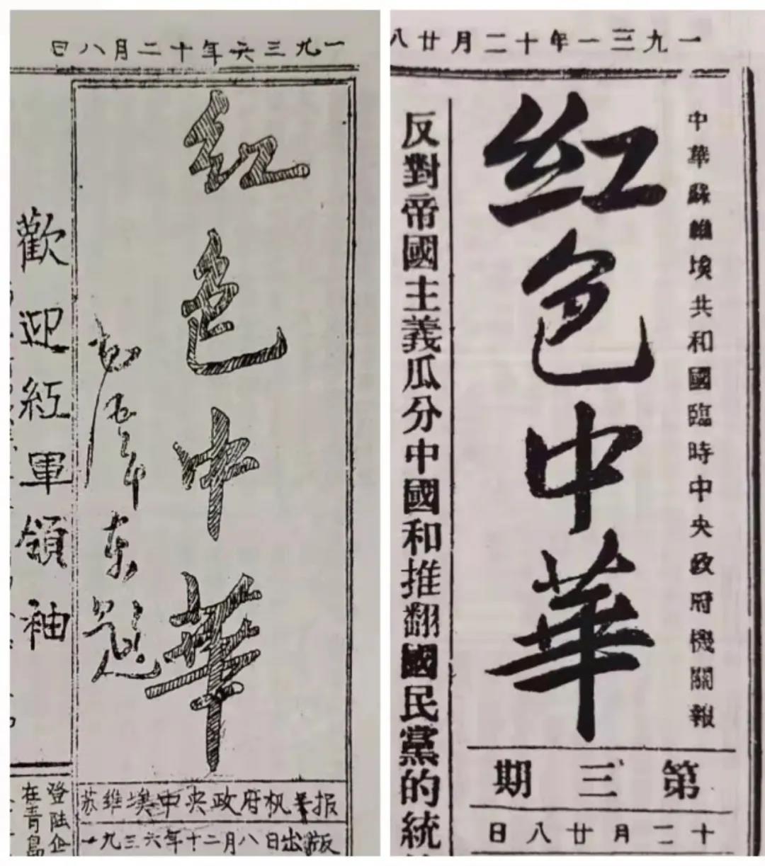 《红色中华》报最初的报头(右)和毛泽东同志题写的报头(左)。
