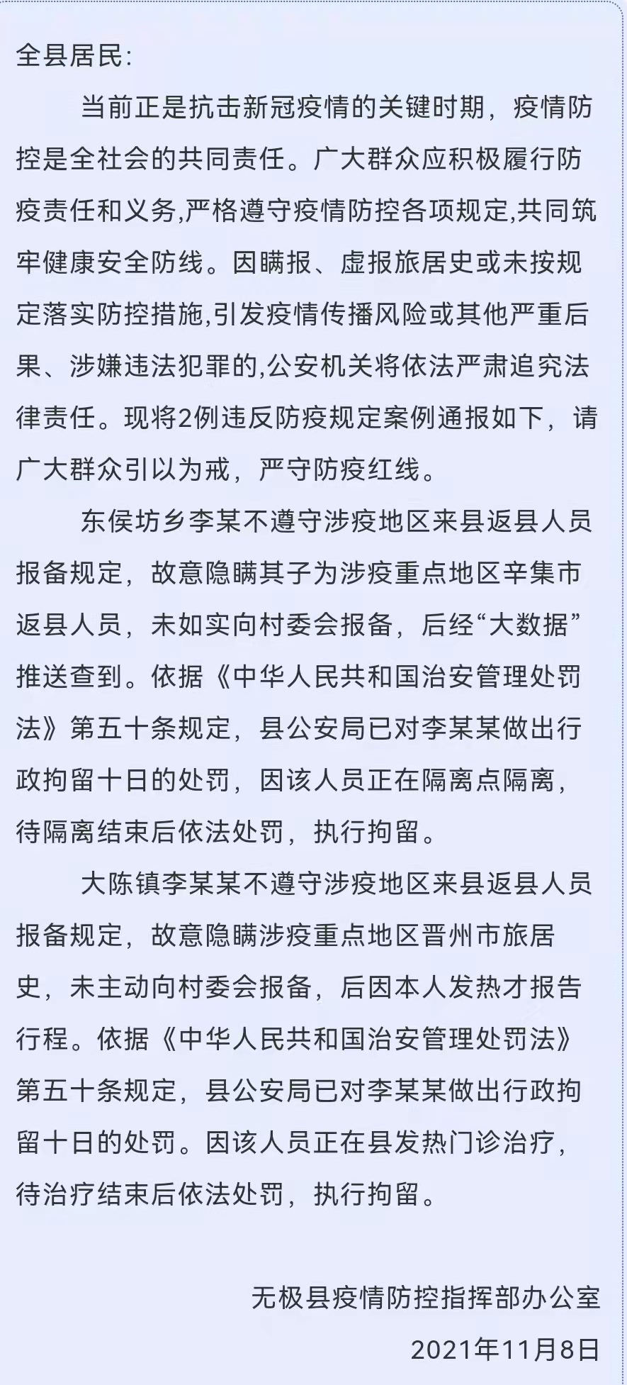 11月8日,石家庄市无极县疫情防控指挥部办公室通报两例违反防疫规定案例,该县李某和李某某不遵守涉疫地区来县返县人员报备规定,依据《中华人民共和国治安管理处罚法》第五十条规定,县公安局已对李某某做出行政拘留十日的处罚。