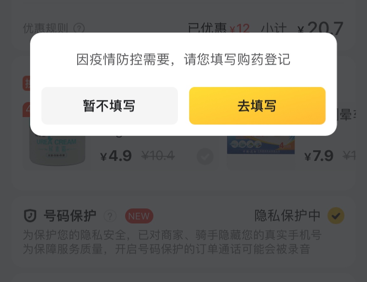 记者在某知名生活服务App上搜索一款120g装的秋梨润肺膏,随机进入海王星辰药房(马家堡店)。提交药品订单后,页面出现“因疫情防控需要,请您填写购药登记”的提示。
