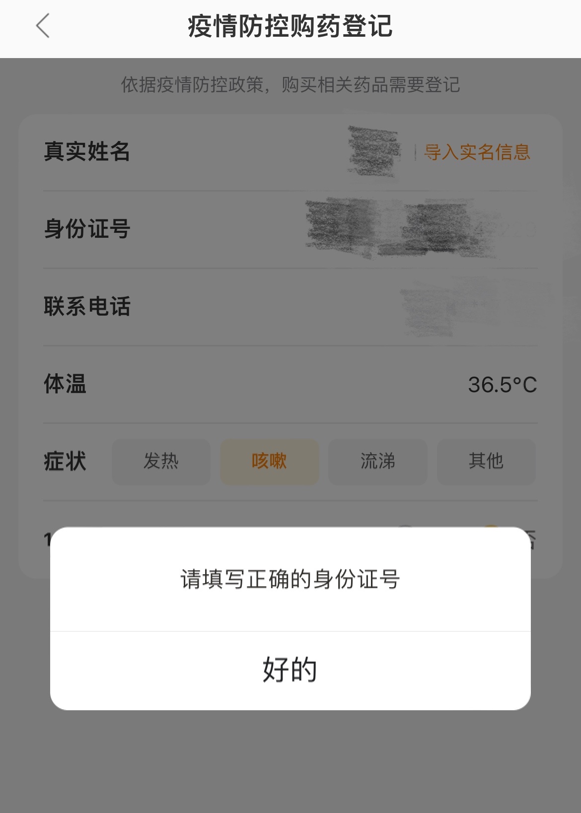 在疫情防控购药登记页面,消费者需要填写用药人的真实姓名、身份证号、联系电话、体温信息。还要在发热、咳嗽、流涕等症状中进行勾选,并确认用药人14天内是否去过境外、中高风险地区。