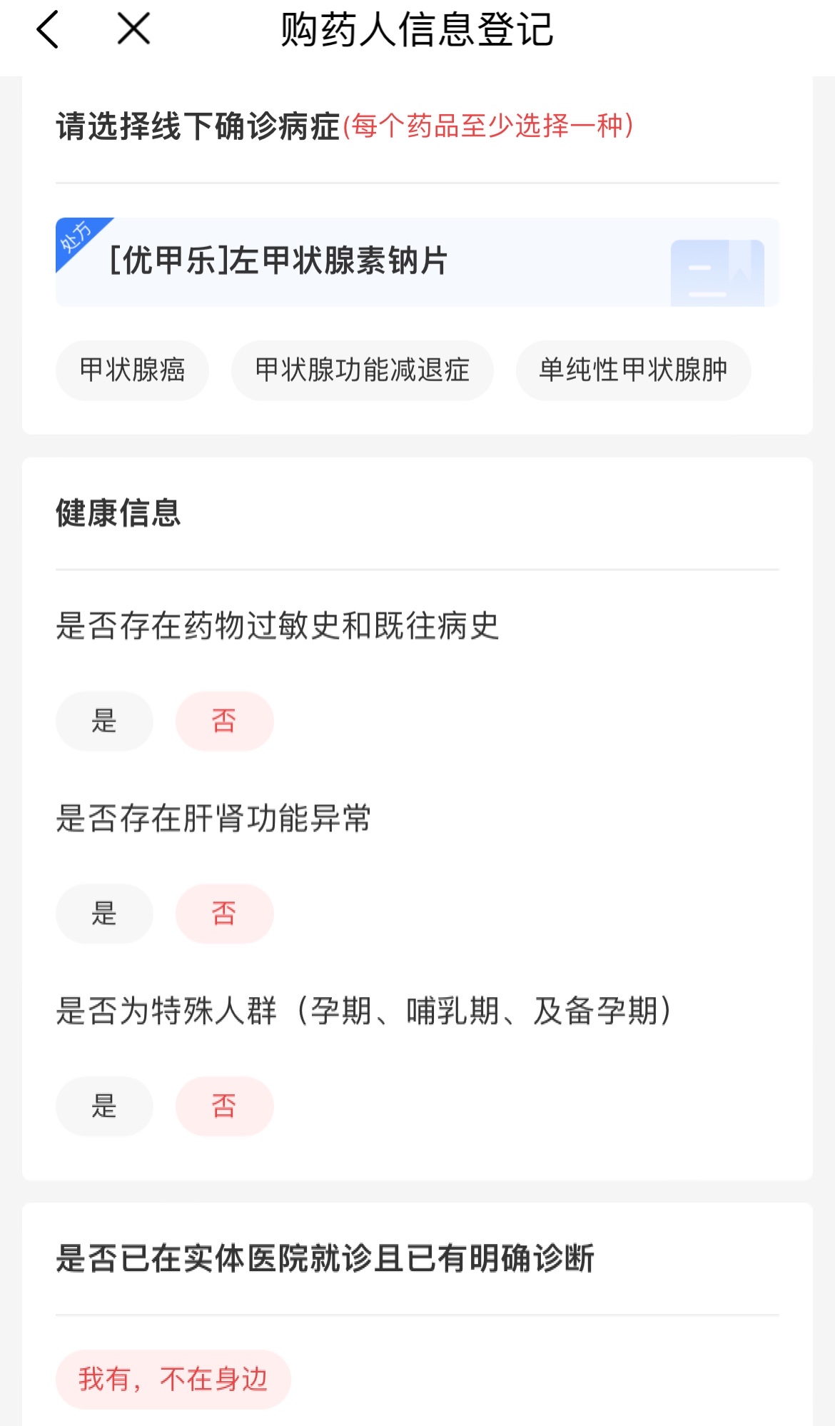 再向下滑动,健康信息中“是否存在药物过敏史和既往病史”“是否存在肝肾功能异常”“是否为孕期、哺乳期、备孕期等特殊人群”几个问题,已经自动为购药者选择了“否”。至于“是否已在实体医院就诊且已有明确诊断”的询问,则更十分“贴心”地提供了“我有,不在身边”的回答选项。