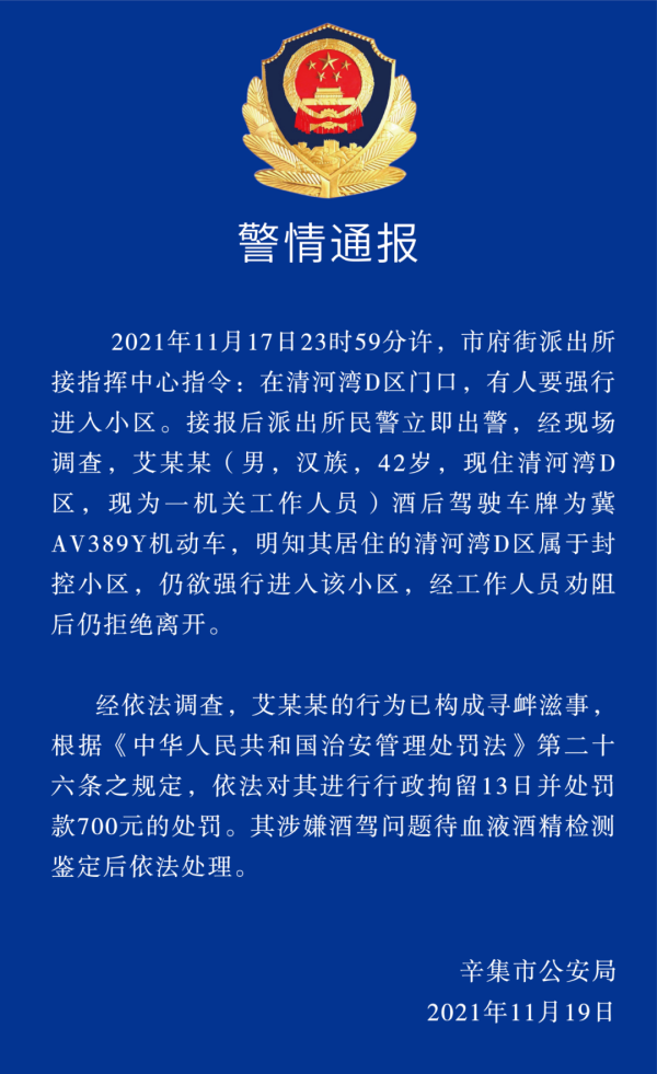 2021年11月17日23时59分许,市府街派出所接指挥中心指令:在清河湾D区门口,有人要强行进人小区。接报后派出所民警立即出警,经现场调查,艾某某(男,汉族,42岁,现住清河湾D区,现为一机关工作人员)酒后驾驶车牌为冀AV389Y机动车,明知其居住的清河湾D区属于封控小区,仍欲强行进人该小区,经工作人员劝阻后仍拒绝离开。