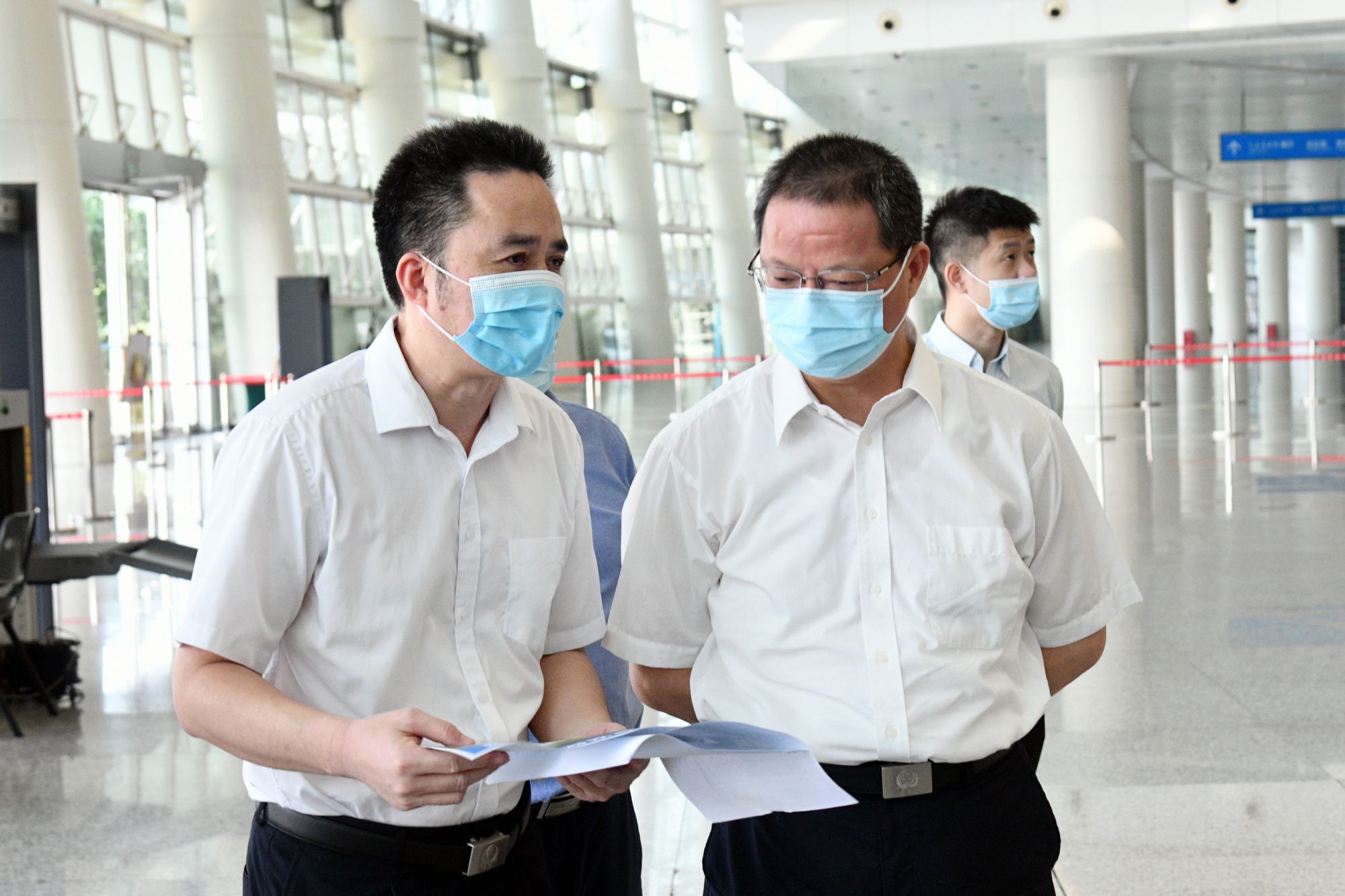 潘东升(前右)督导检查重要会议安保工作(2021年9月23日摄)。新华社发(福州市公安局供图)