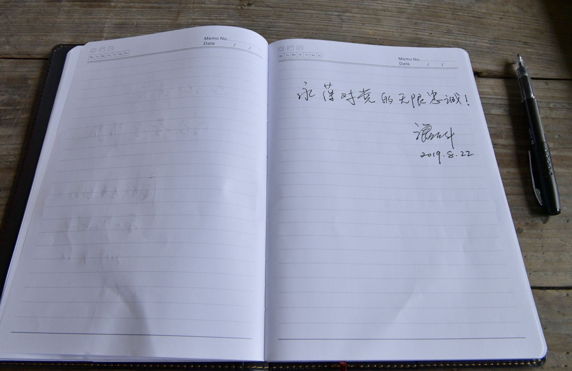 潘东升参加主题党日活动,手书“永葆对党的无限忠诚”(2019年8月22日摄)。新华社发(福州市公安局供图)