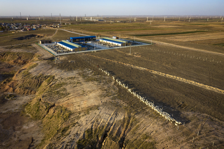 在宁夏吴忠市盐池县大水坑镇宋堡子村生态牧场,工作人员驱赶滩羊在跑道上“锻炼”,以提高肉质品质(2020年11月2日摄,无人机照片)。新华社记者 冯开华 摄