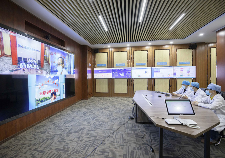 福建省泉州市第一医院医生在宁夏同心县人民医院通过远程会诊为同心县乡镇卫生院的医生提供指导(2020年9月18日摄)。新华社记者 王鹏 摄