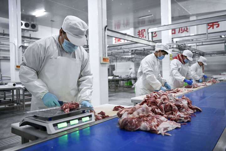 在宁夏盐池滩羊集团的高标准屠宰加工厂内,工人在精细分割滩羊肉(2020年11月2日摄)。新华社记者 冯开华 摄