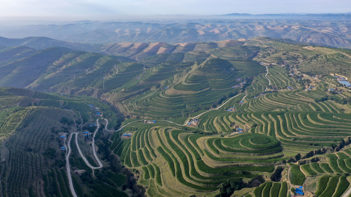 这是7月14日在宁夏固原市彭阳县拍摄的青云湾旱作梯田公园(无人机照片)。新华社记者 冯开华 摄