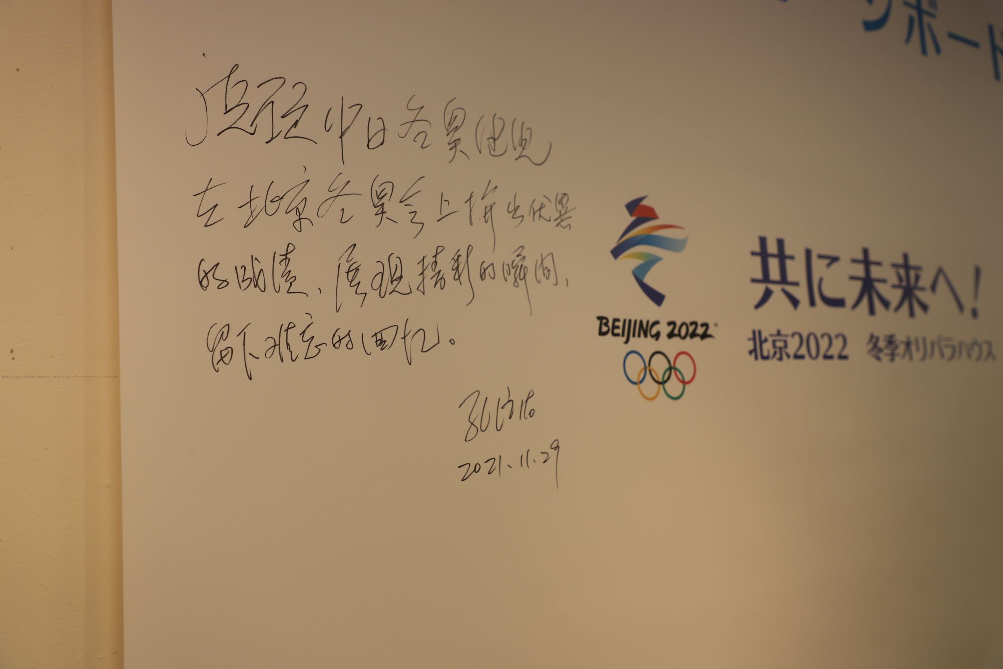11月29日,中国驻日本大使孔铉佑在签字墙留下对北京冬奥会的祝福。新华社记者 杨林 摄
