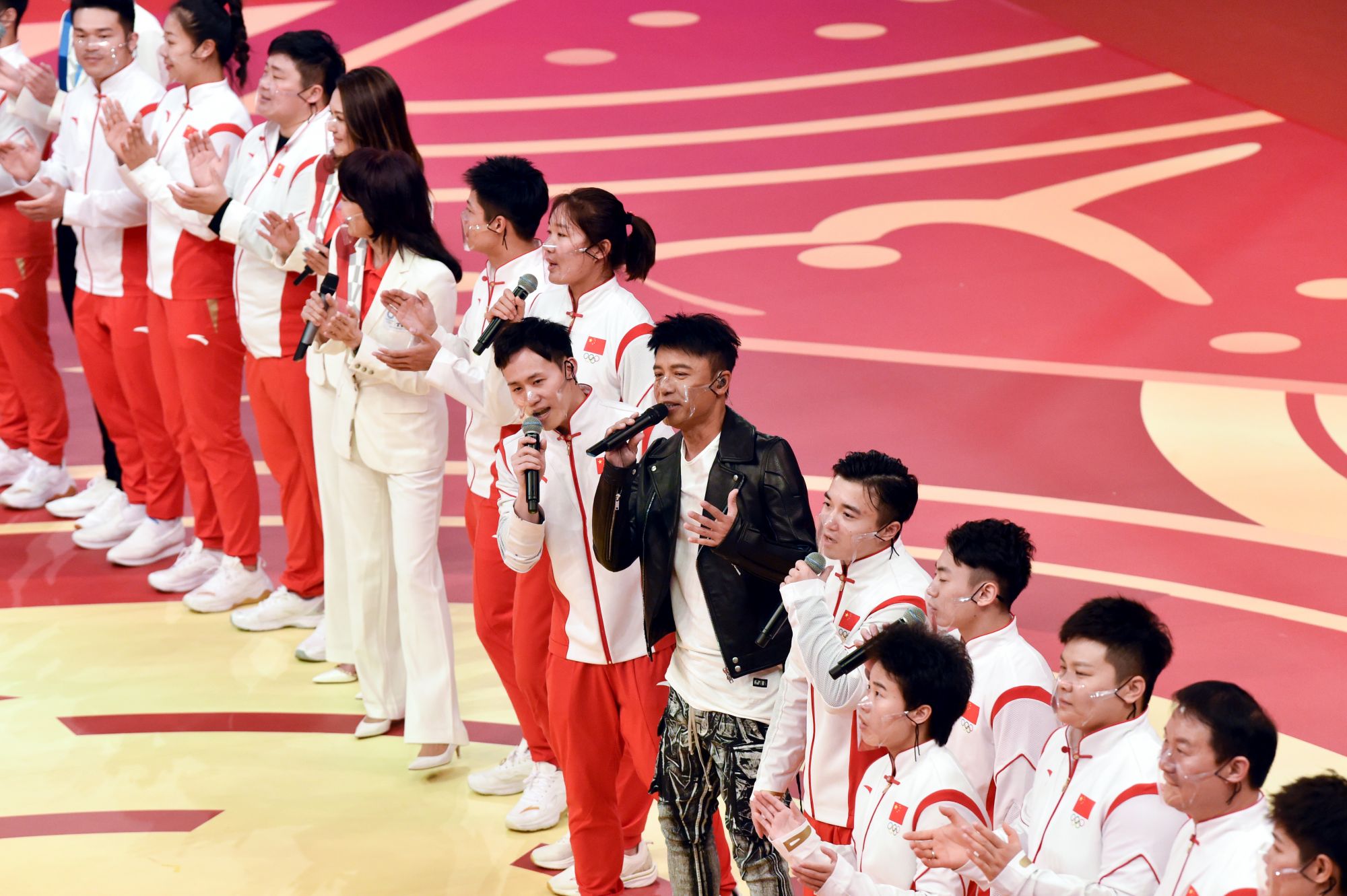 香港歌手李克勤(中)与内地奥运健儿代表团成员一起演唱。新华社记者卢炳辉摄
