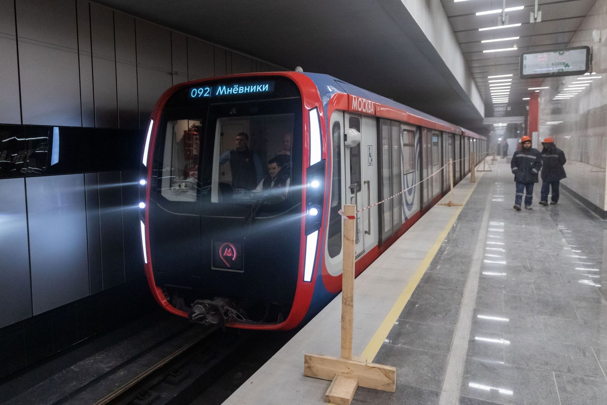 ↑12月2日,在俄罗斯首都莫斯科,试运行车辆驶入莫斯科地铁第三换乘环线西南段米丘林大街站。新华社记者 白雪骐 摄