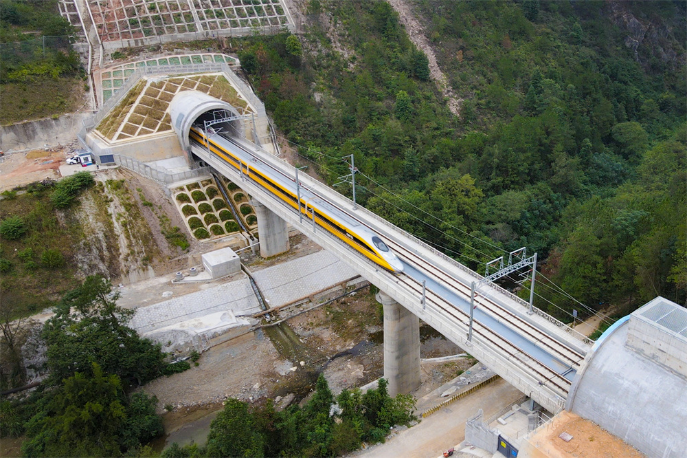 10月14日,列车经过龙南隧道(无人机照片)。新华社发(张海根 摄)