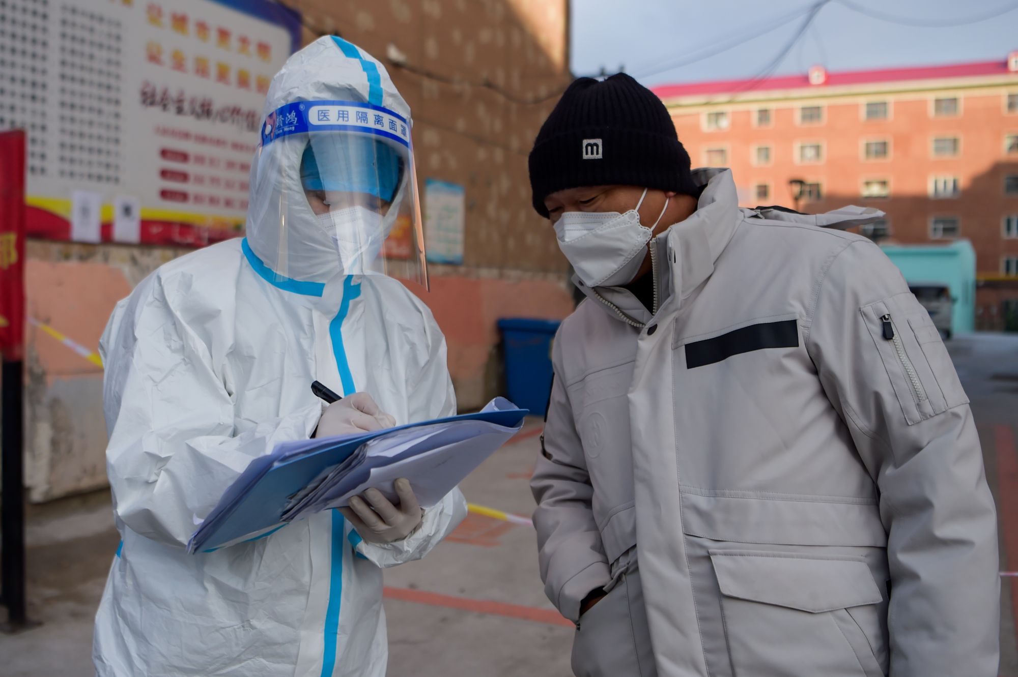 12月10日,在满洲里市白房综合楼小区,社区志愿者在登记居民信息。新华社记者 李志鹏 摄