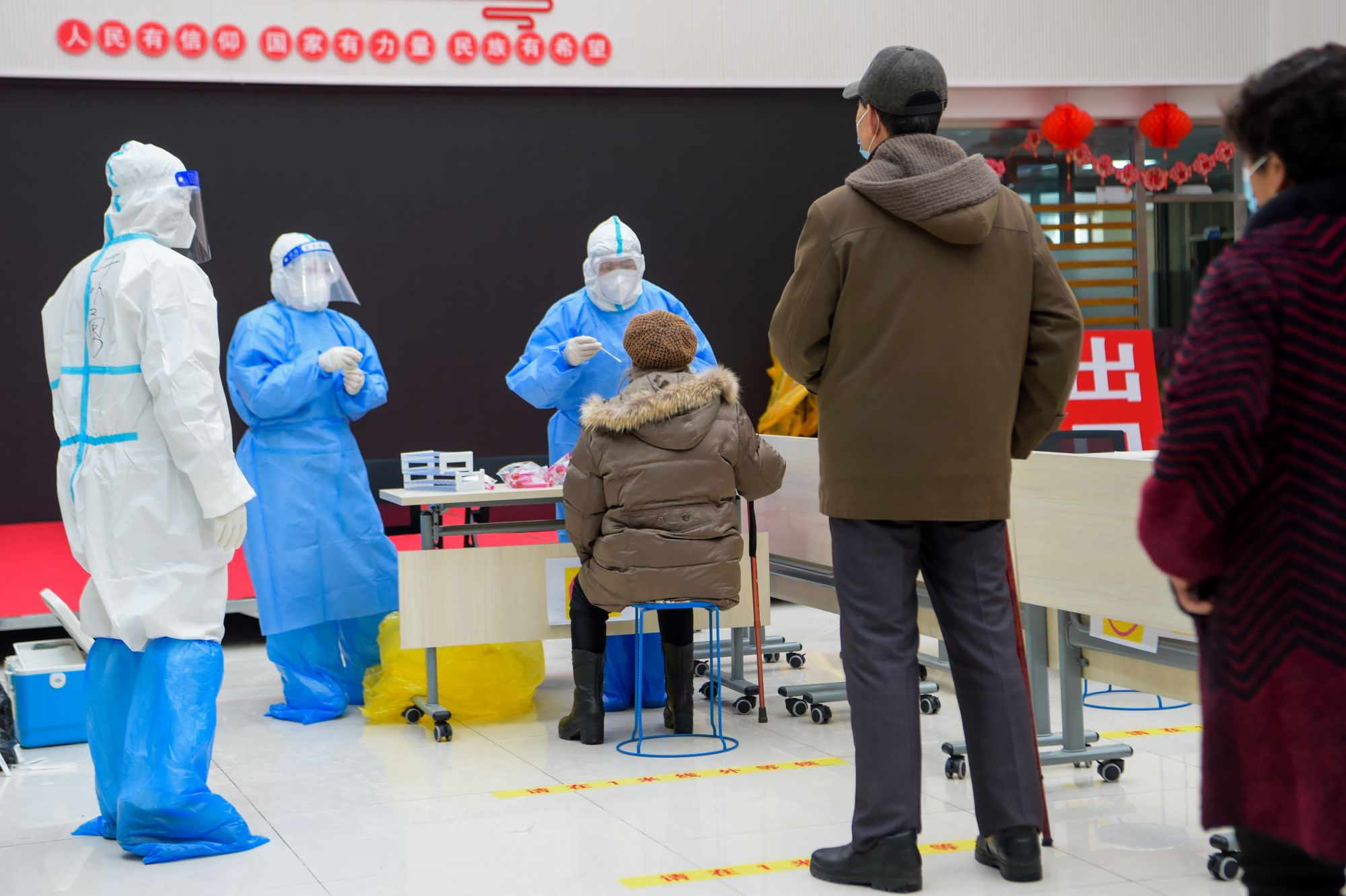11月29日,在满洲里市府欣小区A区核酸采样点,工作人员为居民做核酸采样。新华社记者 李志鹏 摄