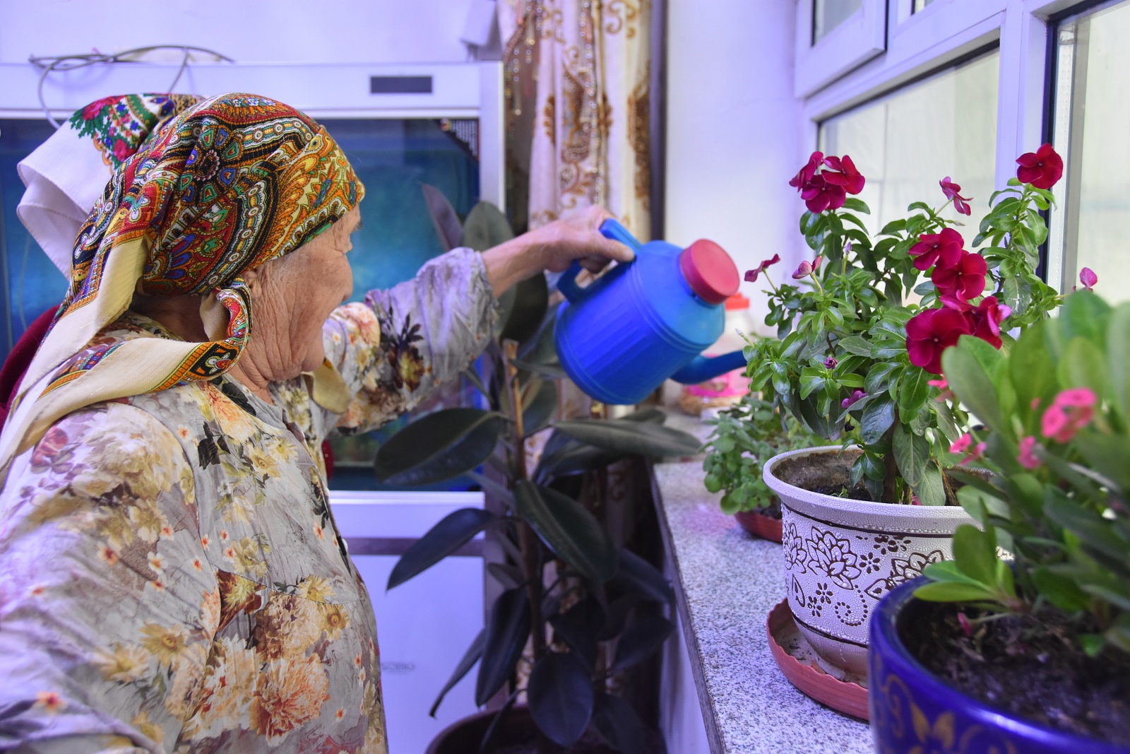 100岁的热比汗·买买提总是闲不住,女儿做饭时在一旁帮帮忙,给家里养的花浇浇水。“现在大家日子过得好,生活就像花一样。”热比汗·买买提说。