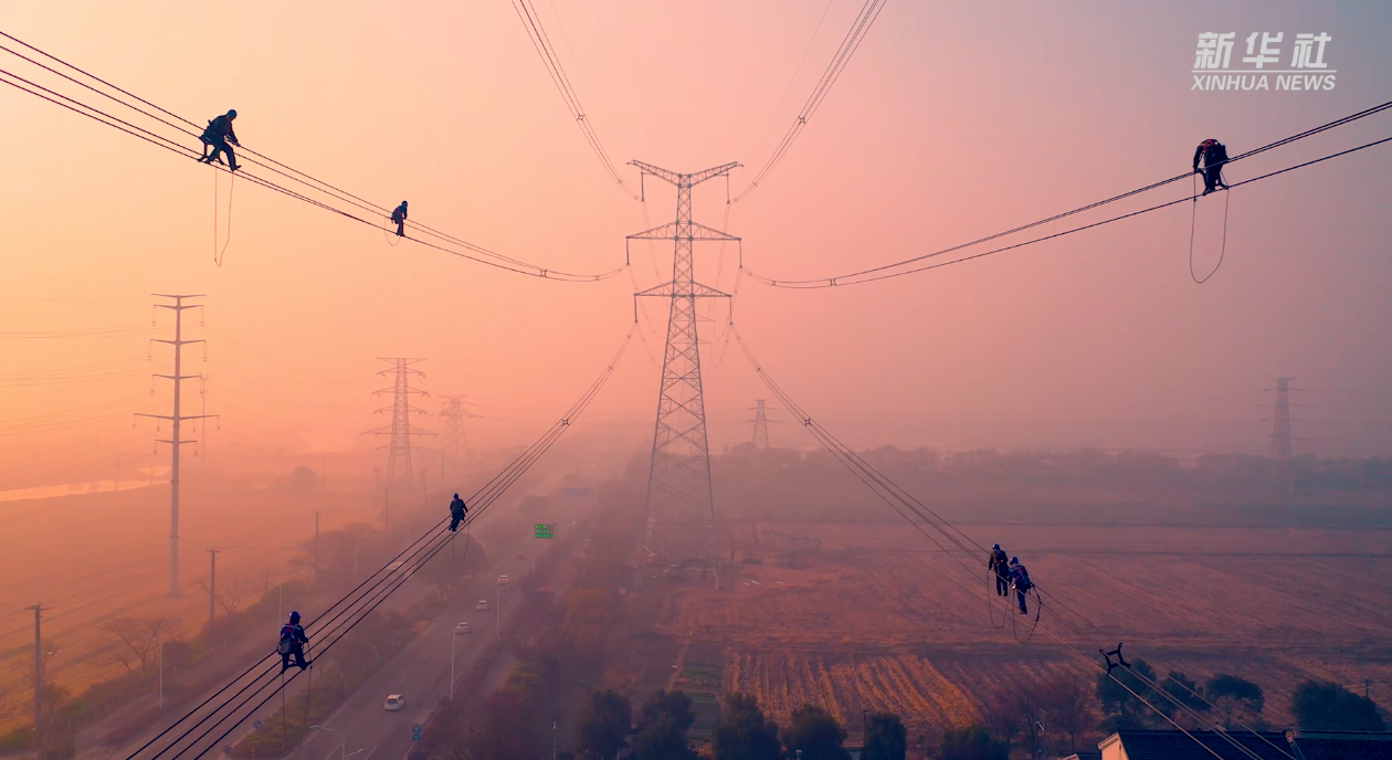 在苏州吴中500千伏苏木苏渎新塔作业现场,12名电力工人徒手爬上80米高的高压线上进行线路验收工作。他们如舞者,在高空翩翩起舞,保障冬日里的用电安全,守护一方安宁。