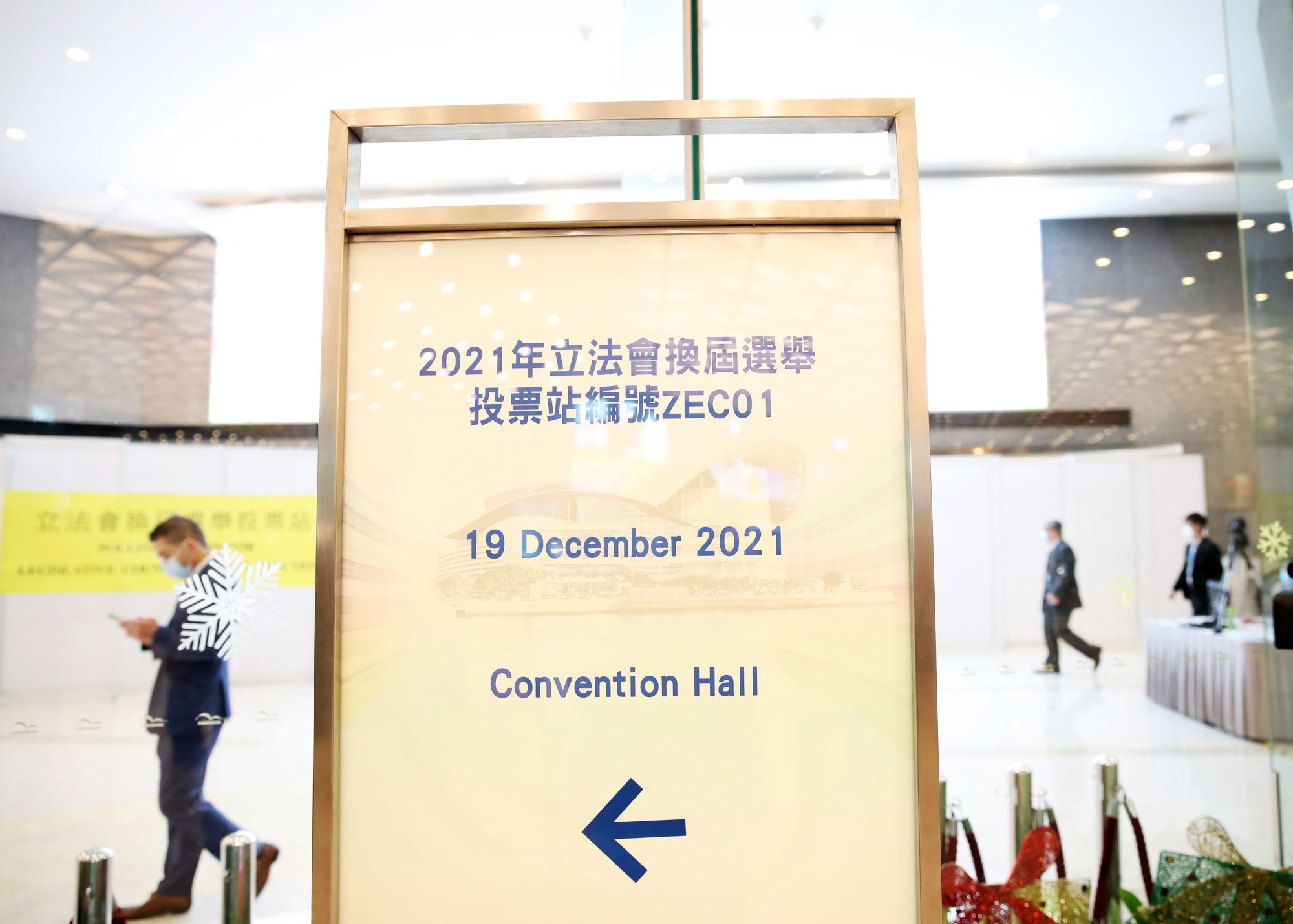 ↑12月19日,在香港会展中心的投票站,工作人员在进行准备。新华社记者 李钢 摄