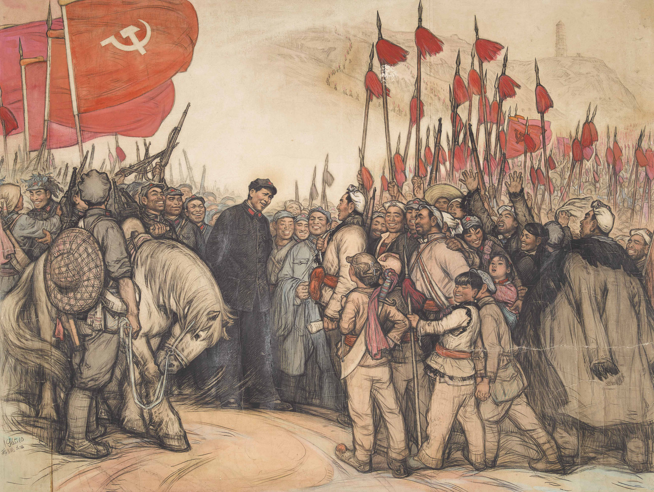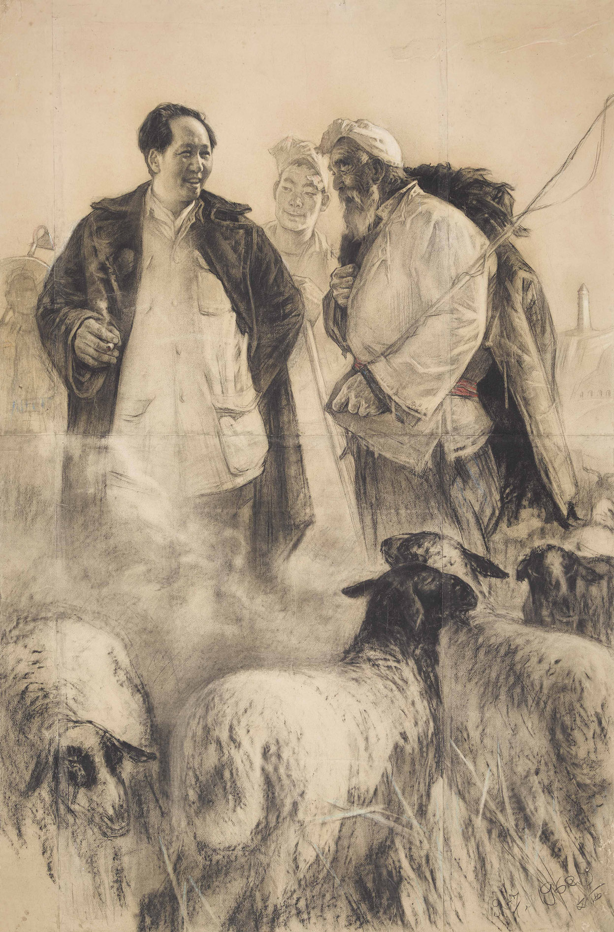 “一些作品的完成稿和素描稿之间存在一定区别,比如在画作《同欢共乐》中,素描稿中没有的人物却在完成稿中出现了,主席的穿戴也不一样了。”策展人说。