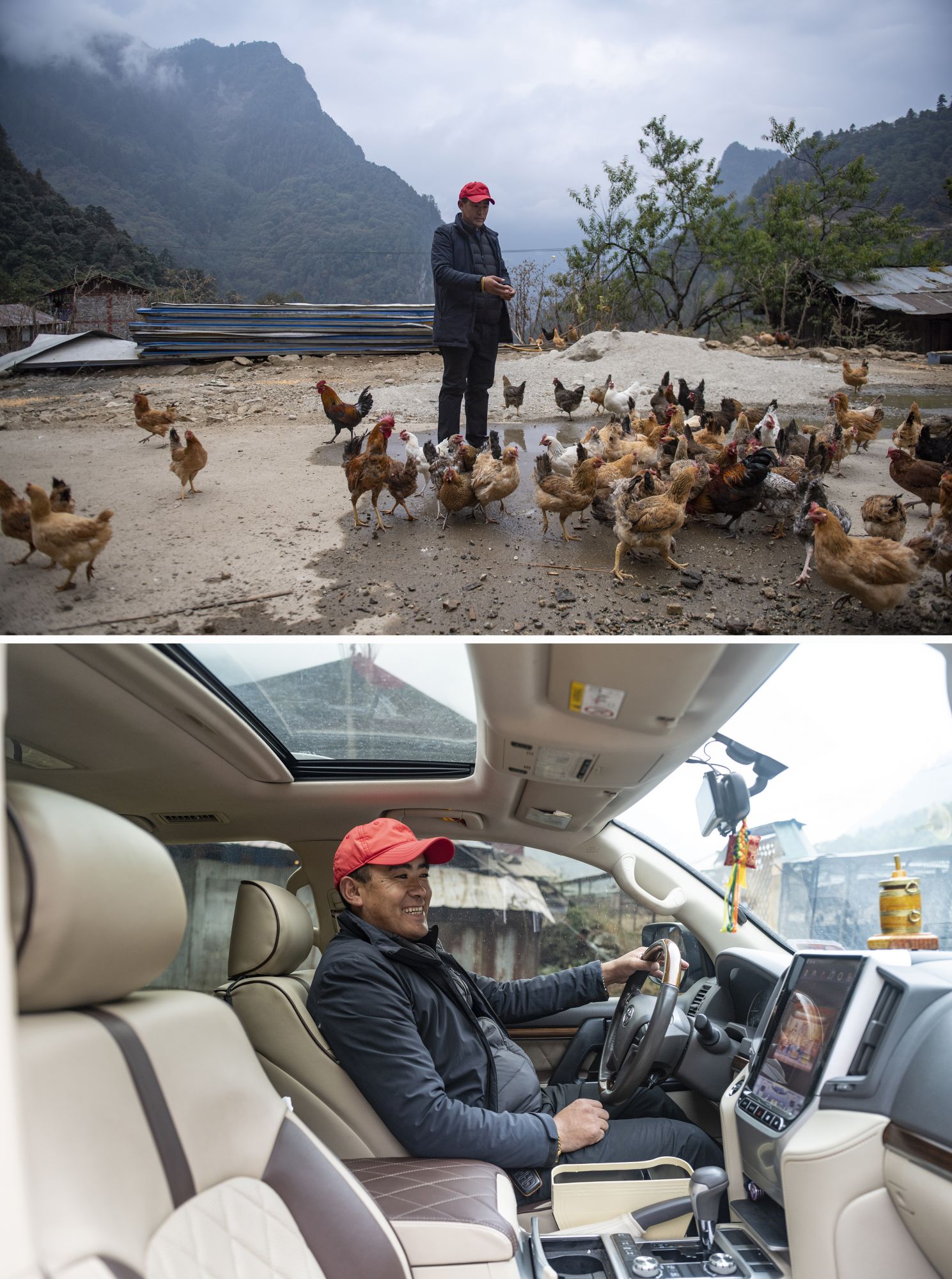 拼版照片:上图为,陈塘镇的致富带头人拉巴塔杰给养鸡场的散养鸡喂食;下图为,拉巴塔杰坐在自己致富后购买的越野车内(均为11月25日摄)。 新华社记者 孙瑞博 摄