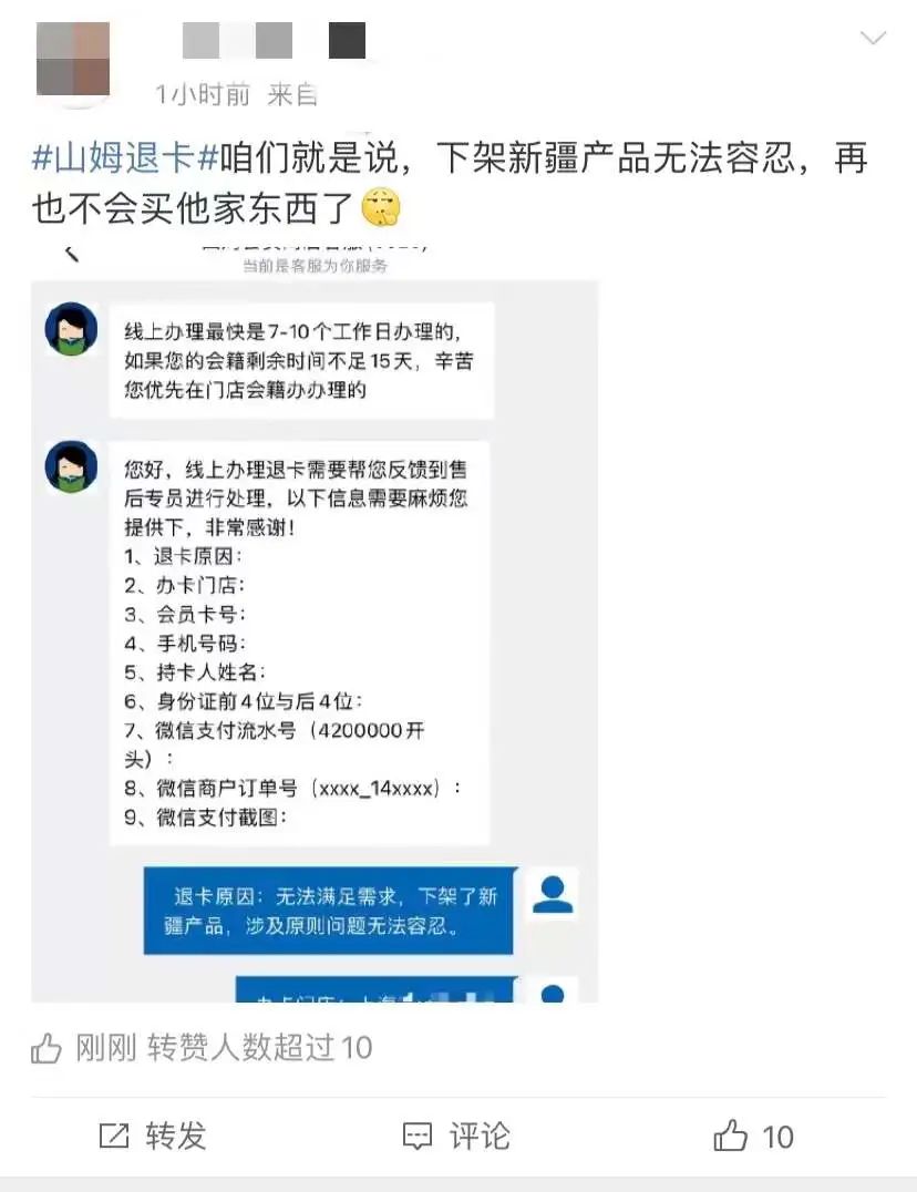 大批原山姆店会员在看到山姆店针对新疆的举动后,选择了退出会员、不再购买山姆任何产品。
