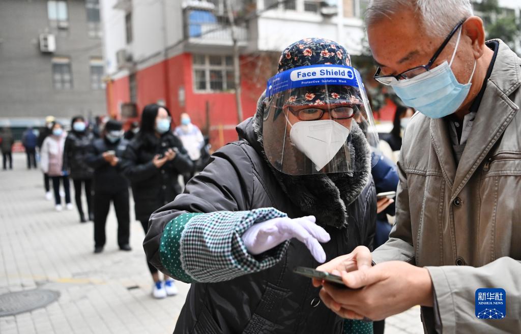 12月27日,志愿者(前左)在陕西省西安市碑林区张家村街道太白社区核酸筛查现场协助居民出示健康码。新华社记者 陶明 摄