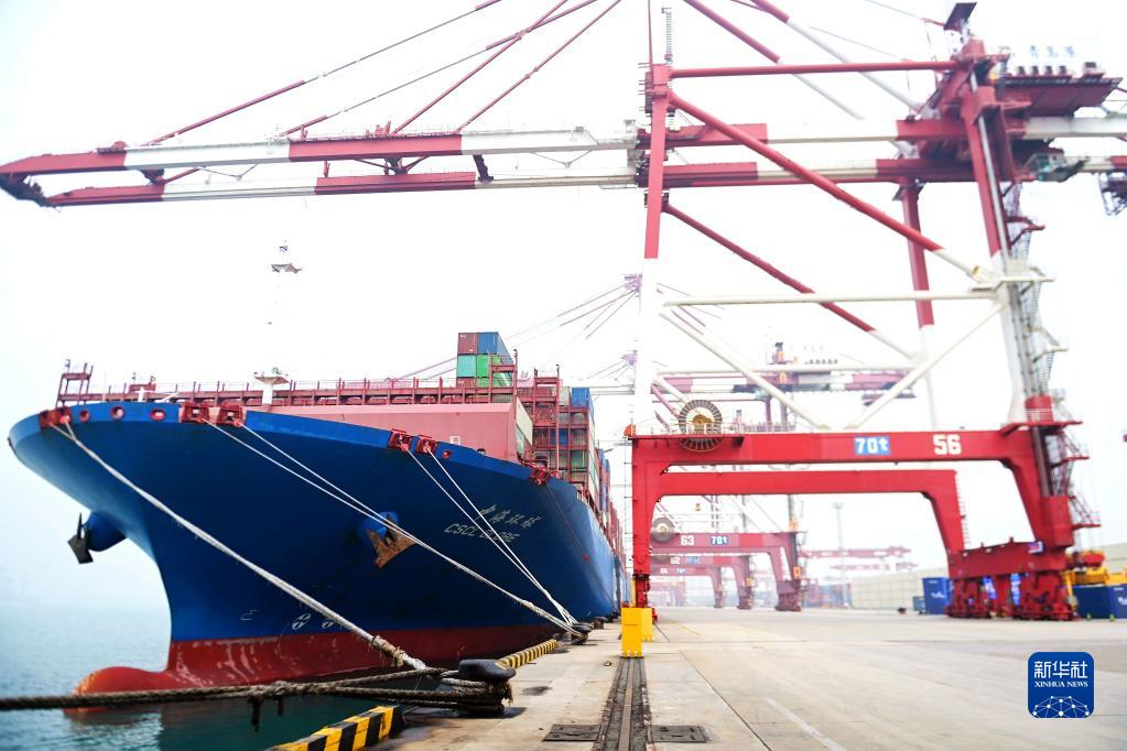 12月23日,在山东港口青岛港前湾集装箱码头,中海环球轮在等待装载山东港口集团第3400万标箱。新华社发(俞方平摄)