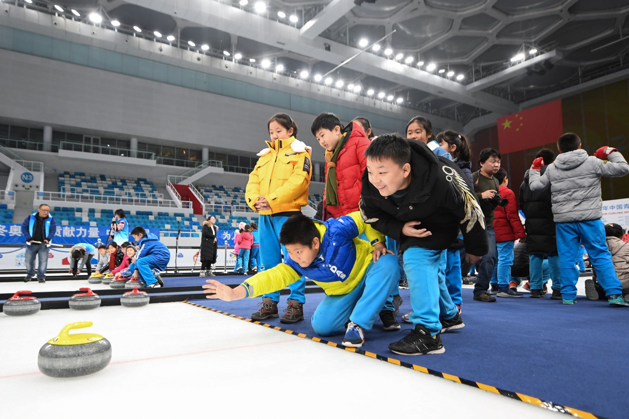 2019年12月10日,北京史家实验学校的学生在“冰立方”体验冰壶。“水立方”国家游泳中心变身“冰立方”,成为世界首个实现“水冰转换”的场馆,未来其南广场地下建设的冰场将全年面向群众开放,为全民冰上运动做好服务。