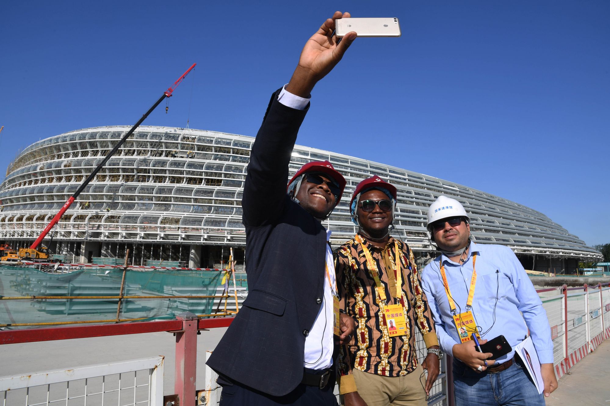 2019年9月24日,境外媒体记者在国家速滑馆“冰丝带”前拍照留念。当日,来自境外82家媒体的103名记者走进国家速滑馆“冰丝带”、国家游泳中心“水立方”和国家体育场“鸟巢”,了解北京2022年冬奥会场馆建设情况。